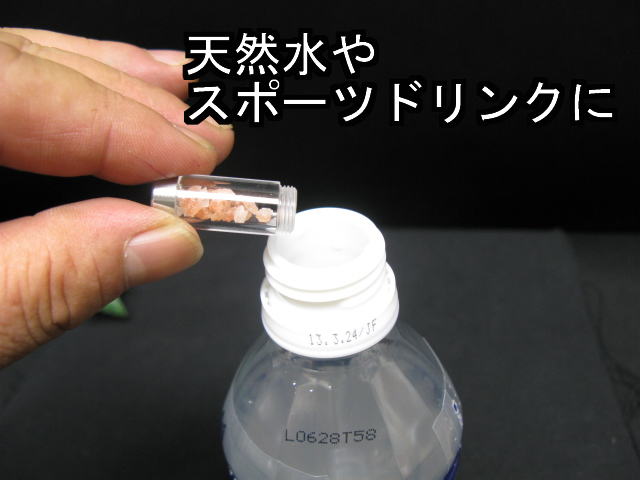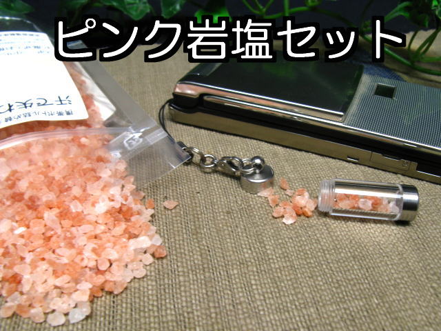 【メール便ポスト投函】 汗で失われた塩分・ミネラル補給、熱中症対策 携帯ストラップ型ボトル【カプセル】と、詰め替え用ヒマラヤ岩塩セット 携帯ストラップですので、アクセサリー的に気軽に持ち運びできます。 ペンダントトップでもご利用頂けます。 いつもでどこでも、汗で失われた塩分・ミネラルを吸収できます。 耐久性設計の携帯ストラップ用ボトル【カプセル】の仕様【詳細】 大きさ(本体外サイズ):直径11ミリ 長さ30ミリ(取付金具部除く) 内径(内側の直径)7ミリ 筒内部の高さ25ミリ 重さ:約6g(岩塩0.9g含む) ボトルに入る容量:約1.2ml(1.2cc) 材質:上下キャップ部:ハイグレードステンレスJIS規格SUS 18-8-S(腐食・錆に強い)日本製 開閉:ネジ式(ネジのように手で回して開閉するタイプ) 錆びないように下キャップにシリコン栓を装着キャップは固定しています。 筒部:クリアアクリル(厚み2ミリ) ハード仕様 耐衝撃試験3m落下テスト合格(着地:コンクリート面) 耐久性・丈夫さ・頑丈さを重視したオリジナルです。 携帯電話は、いろいろハードな場面がありますが、ぶつけても割れない強固に設計されています。 国内生産【ラジャクイーンだけの特別仕様カプセル】日本製(日本国内で作っています。) ヒマラヤ岩塩:約0.9g(2-3ミリ粒)入り 詰め替え用岩塩【ヒマラヤ岩塩】ピンク 大きさ2-3ミリの粒、ボトルに入るサイズ 内容量:100g チャック式密閉パック入り開封後も密閉保管できます。 名称:塩 原材料名:岩塩 内容量:100g 原産国名:パキスタン 製造方法:原材料名:岩塩(パキスタン)工程:採掘・洗浄・粉砕・洗浄 市販のスポーツドリンクには、塩分が約0.4g-0.6gが入っています。平均で約0.5g程度 使い方 スポーツドリンク(500ml)にボトルの2/3程度(0.5g-0.6g)の岩塩を入れて、2倍の塩分になります。 味:おしるこ、ケーキなどスイーツにも甘さを引き立たせる為に、塩分が入っています、スポーツドリンクでは、しょっぱさよりも甘さが出てきます。 倍の1.2gを入れると、しょっぱさが多少出てくる程度です。 天然水にボトルの2/3程度(0.5g-0.6g)の岩塩を入れます。 スポーツドリンクと同じ程度の塩分になります。 味:少し塩っ気がある程度です。しょっぱさはそんなにありません。 砂糖などを小さじ半分程度を入れると飲みやすくなります。 専用ボトルを使わない場合:岩塩の量は、小さじ1/5程度又は、粒で20粒程度で0.5g前後になります、500mlに入れてスポーツドリンクと同じ程度の塩分補給となります。 これも有効! 岩塩5−6粒を舌の真ん中にのせてお水といっしょにサッと飲む。舌の真ん中は味覚を感じませんのでしょっぱさを感じないで体内に取り込めます。 ムギ茶・ウーロン茶・炭酸飲料・ジュースなど塩分が少ない飲料でも、ご利用できます、500mlで10−20粒、お好みに合わせて入れてください。以外と美味しいんです。しかも、塩分・ミネラルを簡単に補給できます。 ラジャクイーンの食用岩塩の特徴 天然岩塩鉱床の採掘岩塩 ヒマラヤの塩(岩塩) 海水が結晶化したこの岩塩には、鉄分、カリウムなど多様な成分が含まれており、添加物(固結防止剤)は一切使用しておりません。 厚生労働省に食用塩としての輸入許可を受けております。 検品、充填は国内塩製造場にて実施、美味しくて安全・安心なヒマラヤ岩塩をご提供するため、様々な品質チェック、工程管理を実施しています。 食塩である岩塩は厚生労働省指定検査機関にて成分分析、重金属検査、放射性セシウム134/137検査を実施しています。 岩塩は、汚染・放射性物質とは無縁の太古の海の恵です。 採掘、洗浄、乾燥、粉砕された岩塩がコンテナ(荷姿:密閉袋)で通関、厚生労働省 食品検査後、弊社に運ばれ、食品加工室で開封され検品後に袋詰めされます。 安心の食用塩(岩塩)をお届け致します。 熱中症予防 スポーツドリンクや、経口補水液等、水分・塩分補給をこまめに取る事が大切です。 経口補水液は、薬局で売っていますが、手軽に作る事ができます。 スポーツドリンクより糖分が少なく塩分補給ができます。 岩塩は、塩分だけでなく体に必要な栄養成分が含まれています。 病院で勧める【経口補水液の作り方】 水 1リットル(1000ml) 岩塩 小さじ3分の1又は2分の1 約2−3g 砂糖 大さじ4杯+小さじ1杯 約40g 溶けるまで良く振ってください。 甘いと言う方は砂糖を30g前後で調整してください。 果汁(レモン・グレープフルーツ・ポッカレモン)などを加えると飲みやすくなります。 夏は、こまめに水分補給・塩分補給が必要です。 鬼に金棒 熱中症対策 店長の一言 当店の岩塩キャンディ4粒でスポーツドリンク500ml、1本分の塩分が取れます。しかも美味しい。 いざと言う時に、お水しかない、お水に岩塩を入れて、岩塩キャンディをなめれば、とってもおいしく、しっかりと塩分・ミネラルを補給できます。 岩塩入りストラップと、岩塩キャンディを1袋もってお出かけをオススメ致します。 天然岩塩鉱床の採掘岩塩 ヒマラヤの塩(岩塩)食用 岩塩 チャック付き密閉パック ※数億年