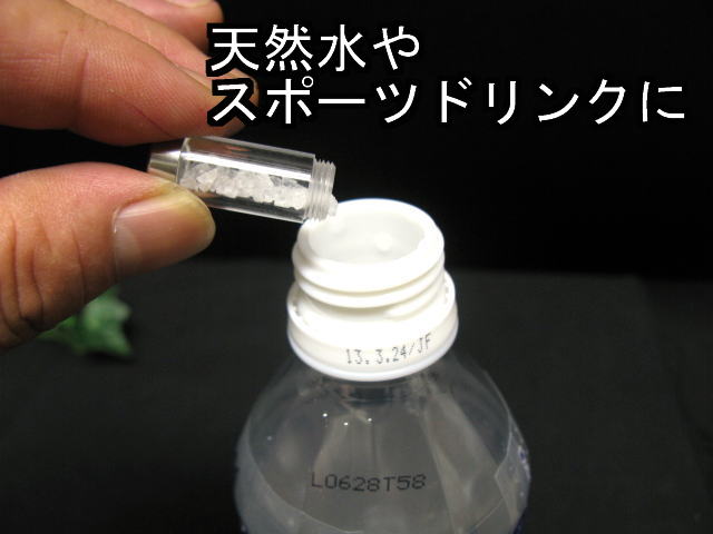 汗で失われた塩分・ミネラル補給、熱中症対策 携帯ストラップ型ボトル【カプセル】と、詰め替え用ヒマラヤ岩塩セット 携帯ストラップですので、アクセサリー的に気軽に持ち運びできます。 ペンダントトップでもご利用頂けます。 いつもでどこでも、汗で失われた塩分・ミネラルを吸収できます。 耐久性設計の携帯ストラップ用ボトル【カプセル】の仕様【詳細】 大きさ(本体外サイズ):直径11ミリ 長さ30ミリ(取付金具部除く) 内径(内側の直径)7ミリ 筒内部の高さ25ミリ 重さ:約6g(岩塩0.9g含む) ボトルに入る容量:約1.2ml(1.2cc) 材質:上下キャップ部:ハイグレードステンレスJIS規格SUS 18-8-S(腐食・錆に強い)日本製 開閉:ネジ式(ネジのように手で回して開閉するタイプ) 筒部:クリアアクリル(厚み2ミリ) ハード仕様 耐衝撃試験3m落下テスト合格(着地:コンクリート面) 耐久性・丈夫さ・頑丈さを重視したオリジナルです。 携帯電話は、いろいろハードな場面がありますが、ぶつけても割れない強固に設計されています。 国内生産【ラジャクイーンだけの特別仕様カプセル】日本製(日本国内で作っています。) ヒマラヤ岩塩:約0.9g(2-3ミリ粒)入り 詰め替え用岩塩【ヒマラヤ岩塩】ホワイト 大きさ2-5ミリの粒、ボトルに入るサイズ 内容量:100g チャック式密閉パック入り開封後も密閉保管できます。 名称:塩 原材料名:岩塩 内容量:100g 原産国名:パキスタン 製造方法:原材料名:岩塩(パキスタン)工程:採掘・洗浄・粉砕・洗浄 市販のスポーツドリンクには、塩分が約0.4g-0.6gが入っています。平均で約0.5g程度 使い方 スポーツドリンク(500ml)にボトルの2/3程度(0.5g-0.6g)の岩塩を入れて、2倍の塩分になります。 味:おしるこ、ケーキなどスイーツにも甘さを引き立たせる為に、塩分が入っています、スポーツドリンクでは、しょっぱさよりも甘さが出てきます。 倍の1.2gを入れると、しょっぱさが多少出てくる程度です。 天然水にボトルの2/3程度(0.5g-0.6g)の岩塩を入れます。 スポーツドリンクと同じ程度の塩分になります。 味:少し塩っ気がある程度です。しょっぱさはそんなにありません。 砂糖などを小さじ半分程度を入れると飲みやすくなります。 専用ボトルを使わない場合:岩塩の量は、小さじ1/5程度又は、粒で20粒程度で0.5g前後になります、500mlに入れてスポーツドリンクと同じ程度の塩分補給となります。 これも有効! 岩塩5−6粒を舌の真ん中にのせてお水といっしょにサッと飲む。舌の真ん中は味覚を感じませんのでしょっぱさを感じないで体内に取り込めます。 ムギ茶・ウーロン茶・炭酸飲料・ジュースなど塩分が少ない飲料でも、ご利用できます、500mlで10−20粒、お好みに合わせて入れてください。以外と美味しいんです。しかも、塩分・ミネラルを簡単に補給できます。 ラジャクイーンの食用岩塩の特徴 天然岩塩鉱床の採掘岩塩 ヒマラヤの塩(岩塩) 海水が結晶化したこの岩塩には、鉄分、カリウムなど多様な成分が含まれており、添加物(固結防止剤)は一切使用しておりません。 厚生労働省に食用塩としての輸入許可を受けております。 検品、充填は国内塩製造場にて実施、美味しくて安全・安心なヒマラヤ岩塩をご提供するため、様々な品質チェック、工程管理を実施しています。 食塩である岩塩は厚生労働省指定検査機関にて成分分析、重金属検査、放射性セシウム134/137検査を実施しています。 岩塩は、汚染・放射性物質とは無縁の太古の海の恵です。 採掘、洗浄、乾燥、粉砕された岩塩がコンテナ(荷姿:密閉袋)で通関、厚生労働省 食品検査後、弊社に運ばれ、食品加工室で開封され検品後に袋詰めされます。 安心の食用塩(岩塩)をお届け致します。 熱中症予防 スポーツドリンクや、経口補水液等、水分・塩分補給をこまめに取る事が大切です。 経口補水液は、薬局で売っていますが、手軽に作る事ができます。 スポーツドリンクより糖分が少なく塩分補給ができます。 岩塩は、塩分だけでなく体に必要な栄養成分が含まれています。 病院で勧める【経口補水液の作り方】 水 1リットル(1000ml) 岩塩 小さじ3分の1又は2分の1 約2−3g 砂糖 大さじ4杯+小さじ1杯 約40g 溶けるまで良く振ってください。 甘いと言う方は砂糖を30g前後で調整してください。 果汁(レモン・グレープフルーツ・ポッカレモン)などを加えると飲みやすくなります。 夏は、こまめに水分補給・塩分補給が必要です。 鬼に金棒 熱中症対策 店長の一言 当店の岩塩キャンディ4粒でスポーツドリンク500ml、1本分の塩分が取れます。しかも美味しい。 いざと言う時に、お水しかない、お水に岩塩を入れて、岩塩キャンディをなめれば、とってもおいしく、しっかりと塩分・ミネラルを補給できます。 岩塩入りストラップと、岩塩キャンディを1袋もってお出かけをオススメ致します。 天然岩塩鉱床の採掘岩塩 ヒマラヤの塩(岩塩)食用 岩塩 チャック付き密閉パック ※数億年の長い生成期間を経ている為、ニガリ成分がほとんどありません。 ※食用岩塩として通関許可を取