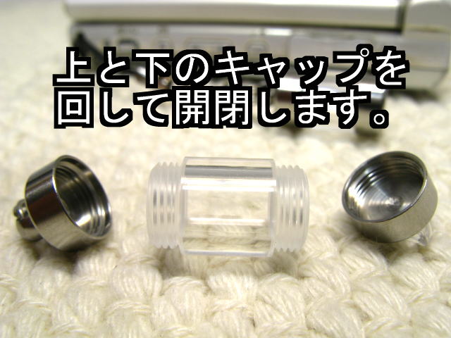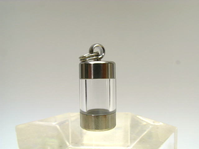 空(から)のボトル【カプセル】には、いろいろなものが入れられます。肌身離さず持ち歩ける携帯ストラップのサイズ 自分だけのアクセサリー ステンレス仕様のボトル・カプセル、中身が見える透明タイプ、円柱ミニ、携帯ストラップ・ペンダントトップにお好みのものを入れて手軽に持ち歩きできます。 空のボトル【空カプセル】携帯ストラップやペンダント用のミニミニサイズ【プチサイズ】 スマートフォン・iPadにも・・バック・リュック・ポーチにチャームとして、 自分作りのプレゼント 自分だけのものを入れて、どこにもないストラップやペンダント・アクセサリーを作れます。 デコ電(携帯デコ)のようにボトル外側をデコレーションして、オリジナルも作れます。 それをプレゼント・・・世界に1つしかない自分作りのものを贈っちゃう、最高ですね。 空ボトル【空のカプセル】に、、、何を入れる!? パワーストーン【天然石】や、ネックレスでピルケース【薬入れ】として、星の砂、お守り、ミニフラワー、写真・ブロマイド・フォト・秘密の○○、など、自由に入れられます。 カラーセラピー ボトルに色水(カラーの液体)を入れられます。 青、オレンジなど、カラーセラピーカラーを作れます。 ◆注意 【香水・アロマオイル等不可】 香水・アロマオイルを入れる場合、揮発性の高い成分が含まれる為、筒のアクリル部分にヒビが入ったり割れたりします。それ以外でも有機溶剤類・揮発性の高い成分等も同じ現象が起こります。 上品な仕上がり、そして耐衝撃性・耐久性・耐腐食性・防水性も兼ね備えたボトルです。 完成まですべて日本国内生産、ラジャクイーンだけのオリジナルです。 耐久性設計の携帯ストラップ用ボトル【カプセル】の仕様【詳細】 大きさ(本体の外側サイズ):直径11ミリ 長さ20ミリ(吊下げ金具部除く) 最上部の吊下げ金具(フック部):高さ5ミリ ステンレス製2重管付き (吊下げ金具穴内径3ミリ 2重管内径5ミリ) 2重管を外して直接吊下げ金具穴(3ミリ径)にチェーン・皮ひもを通してお使いになれます。 内部サイズ:内径(内側の直径)7ミリ 筒内部の高さ18ミリ 重さ:約4g 材質:上下キャップ部:ハイグレードステンレスJIS規格SUS18-8-S(腐食・錆に強い)日本製 高品質ステンレスは、腕時計のバンドにも使われているとおり、金属アレルギーにも強い素材です。 開閉:ネジ式(ネジのように手で回して開閉するタイプ) 筒部:アクリル【クリア】(厚み2ミリ) ハード仕様 耐衝撃試験3m落下テスト合格(着地:コンクリート面)社内テスト 耐久性・耐衝撃性・耐水性を重視したオリジナルです。 携帯電話など、いろいろハードな場面での耐衝撃性も兼ね備えています。 ガラス製のガラス小瓶や試験管チャームのように万が一破損した場合、飛び散らないアクリル製(ハード仕様) 国内生産【ラジャクイーンだけの特別仕様カプセル】日本製 耐水性【防水】仕様 【香水・アロマオイル等不可】 雨はもちろん水たまりに落とすなど、衝撃だけでなく耐水性も兼ね備えています。 ボトル内に色水など、液体を入れる場合は、そのまま入れても液体はほぼ漏れませんが、少しずつ揮発(蒸発)します。 ※水や液体を入れる場合、別売の防水用蓋(ふた)をご利用ください。 こちら、防水用の蓋(ふた) 取扱いについて、【注意】 高温(60℃以上)の場所には置かないでください。例えばストーブの近く・車の中・直射日光等 キャップは、ねじ込み開閉型ですが、長い間持ち歩いてゆるむ場合があります、時々締め付け確認してください。 揮発性溶剤(アルコール・メタノール等)入りの溶液は、ご使用になれません。例えば香水、アロマオイルなどを入れるとアクリルにヒビ・割れが起こります。 密閉する為にキャップ【ステンレス】と筒【アクリル】を接着する場合、瞬間接着剤は使用しないでください。 瞬間接着剤は、アクリル部の白化現象が起こり透明感が薄れます。エポキシ系・アクリル系の接着剤をオススメ致します。 耐水性はありますが、長時間、水・湯などに浸けないでください。 ※ライン入り・ゴールド色(チタンコーティング)は、手作りの為3-5日程度掛かります。 ※ストラップ用紐・チェーン等は、別売です。 こちら、ストラップ用紐・ペンダント用チェーン ※説明書は付いていませんので、本ページをご参照ください。 ※長さの加工承り致します。 こちら、40mm以上の長さに加工します。 こちらのボトル【カプセル】は、ラジャクイーンのオリジナルです。試験管チャームよりハードな場面に対応した特別仕様のカプセル【ボトル】です。空ボトル【空カプセル】は、用途いろいろ ストラップ用紐・チェーンは、 こちら、ストラップ用紐・チェーン 他のデザイン・サイズは、 こちら、空のボトル【空ストラップ】全般携帯ストラップ・ペンダントトップの空ボトル【空カプセル】 アクセサリー・パーツ【空瓶・小瓶・ミニボトル・プチカプセル】 空(から)のボトル【カプセル】には、いろいろなものが入れられ
