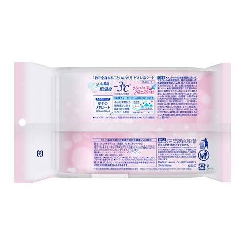 ★注目キャンペーン情報★ 商品情報商品詳細ビオレ冷シート フローラル●1枚で全身まるごとひんやり!ふいた瞬間、肌温度−3℃(※)の汗ふきシート。●冷却ウォーターたっぷりひたひたで、ふいた瞬間から熱を逃がします。●メントール配合で肌すっきり爽快!やぶれにくい厚手の大判シート。●ベタつく汗・ニオイのもととなる皮脂汚れをふき取ります。●ヒアルロン酸(保湿成分)配合。●香りは選べる3種類(無香性/リフレッシュフローラル/ももせっけん)。 ●※二往復ふいた場合使用方法・シートを取り出し、しっかりと肌をふいてください。・手の平サイズに折りたたんで使うのがおすすめです。※使用後はシール接着面のシワをのばしてから、シールをきちんと閉めてください。※乾燥による品質の劣化を防ぐため、開封後はなるべくお早めにお使いください。※液がたっぷりなので、カバンの中などで強く押されると、液がしみ出る場合があります。成分水、エタノール、PEG-60水添ヒマシ油、メントール、トロメタミン、PEG-11メチルエーテルジメチコン、コハク酸、ヒアルロン酸Na、EDTA-2Na、メチルパラベン、フェノキシエタノール、香料注意事項・メントールの冷感刺激に弱い方、アルコール過敏症の方、特に肌の弱い方、乳幼児は使わない。・傷、はれもの、湿疹等異常のあるところ、顔、粘膜、除毛直後には使わない。・肌に異常が生じていないかよく注意して使う。肌に合わない時、使用中に赤み、はれ、かゆみ、刺激、色抜け(白斑等)や黒ずみ等の異常が出た時、直射日光があたって同様の異常が出た時は使用を中止し、皮フ科医へ相談する。使い続けると症状が悪化することがある。・目に入った時は、すぐに充分洗い流す。・シートは水に溶けないので、トイレ等に流さない。・家具、床、電気製品等をふかない。・高温の場所、直射日光のあたる場所には置かない。原産国日本発売元、製造元、輸入元又は販売元花王お問い合わせ先花王株式会社東京都中央区日本売茅場町1-14-100120-165-692広告文責楽天グループ株式会社 電話:050-5444-7654[ボディケア ビオレシーズン]