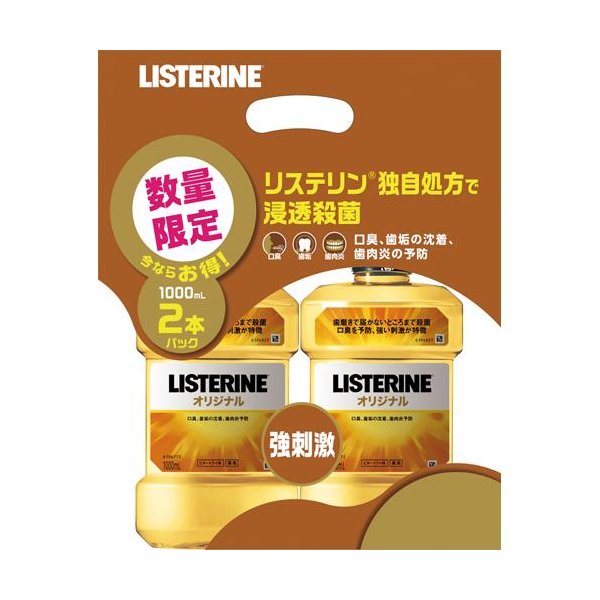 ★注目キャンペーン情報★ 商品情報商品区分:医薬部外品商品詳細薬用リステリン オリジナル●人気のラインアップが2本セットになりました。●4つの薬用成分でお口のトラブルの原因となるバイオフィルム(細菌の塊)に浸透して殺菌する薬用マウスウォッシュです。●歯ミガキだけでは落とせない原因菌を殺菌し、お口の3大トラブル(口臭・歯肉炎・歯垢の沈着)を予防します。●刺激上級者用のスーパードライテイスト。●医薬部外品。効能 効果口臭、歯垢の沈着、歯肉炎予防使用方法日常の歯磨きに加え、適量約20ml(キャップ半分)を口に含み、30秒程すすいでから吐き出してください。水で口をすすぐ必要はありません。成分溶剤:エタノール薬用成分:1.8-シネオール、チモール、サリチル酸メチル、l-メントール保存剤:安息香酸溶解補助剤:ポリオキシエチレンポリオキシプロピレングリコールpH調整剤:安息香酸ナトリウム着色剤:カラメル注意事項・内服液ではありません。飲まないでください。・刺激が強いので口中が荒れているような時は使用しないこと。・幼児の使用には適しません。・ポリオキシエチレンポリオキシプロピレングリコール含有。使用中にじんましん、息苦しさなどの異常があらわれた場合には直ちに使用を中止し、医師又は薬剤師に相談すること。特に、アレルギー体質の人や、薬などで発疹などの過敏症状を経験したことがある人は、十分注意して使用すること。・口中の異常、発疹・発赤・かゆみ等の症状があらわれた場合は、使用を中止し、医師、歯科医師又は薬剤師に相談すること。・低温時には液が不透明になることがありますが、室温でもとに戻ります(効果は変わりません)。・強い光や直射日光のあたる場所に長時間置かないこと。・乳幼児の手の届かないところに保管すること。商品区分医薬部外品原産国中国発売元、製造元、輸入元又は販売元JNTLコンシューマーヘルス株式会社お問い合わせ先ジョンソン・エンド・ジョンソン株式会社101-0065 東京都千代田区西神田3-5-2お客様相談室 0120-101110広告文責楽天グループ株式会社 電話:050-5444-7654[デンタルリンス マウスウォッシュ LISTERINE(リステリン)]