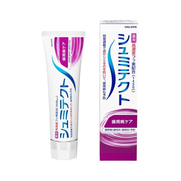 ★注目キャンペーン情報★ 商品情報商品区分:医薬部外品商品詳細シュミテクト 歯周病ケア●知覚過敏の人のことを考え、冷たいものや熱いものなどの刺激によって歯がシミる不快感や痛みを防ぐハミガキです。硝酸カリウムがカリウムイオンとなって、歯髄神経のまわりにイオンバリアを形成し、不快感や痛みを防ぎます。●歯周病(歯肉炎・歯槽膿漏) ケア:グリチルリチン酸モノアンモニウムが歯ぐきの炎症を抑え、歯ぐきを健康に保ちます。●高濃度フッ素配合(1450ppm)で歯質を強化し、ムシ歯の発生・進行を予防します。●ダブルミントのフレーバー。効能 効果歯がしみるのを防ぐ。歯肉炎の予防。歯周炎の予防。ムシ歯の発生および進行の予防。口臭の防止。歯を白くする。口中を浄化する。口中を爽快にする。使用方法・適量をハブラシにとり、ていねいに歯と歯ぐきをブラッシングし、飲み込まずに口をすすいでください。成分湿潤剤:ソルビット液、濃グリセリン、基剤:精製水、粘結剤:含水ケイ酸、清掃剤:含水ケイ酸、薬用成分:硝酸カリウム、フッ化ナトリウム(フッ素)、グリチルリチン酸モノアンモニウム(MAG)、発泡剤:ヤシ油脂肪酸アミドプロピルベタイン、香味剤:香料(ダブルミント)、サッカリンNa、スクラロース、粘度調整剤:キサンタンガム、着色剤:酸化Ti、赤226、清涼剤:ハッカ油、スペアミント油、pH調整剤:水酸化Na注意事項・6歳未満には使用させないでください。・歯周病(歯肉炎・歯槽膿漏)の症状が持続している方、歯ぐきからの出血がみられる小児の場合は、治療を要する疾患も考えられますので歯科医師にご相談ください。・歯がしみる症状には、早急に歯科医師の治療を要する疾患も考えられます。症状が持続する場合には歯科医師にご相談ください。・本剤の使用により異常が現れた場合は使用を中止してください。・本剤の使用により口腔内・顔面のはれが現れた場合は直ちに医師又は歯科医師にご相談ください。・小児の使用に際しては医師、歯科医師へのご相談をおすすめします。・キャップをしめて、小児の手の届かないところに保管してください。・ムシ歯にともなう歯の痛みには効果がありません。ムシ歯でしみる場合は、歯科医師による治療を受けてください。・使用を止めると、再びシミ始めるおそれがあります。シミなくなっても、続けてご使用ください。・キャップをしめて、小児の手の届かないところに保管してください。・直射日光の当たらない涼しい所に保管してください。・このパッケージの説明書をよく読み、保管してください。商品区分医薬部外品原産国日本発売元、製造元、輸入元又は販売元Haleonジャパン株式会社お問い合わせ先Haleonジャパン株式会社〒107-0052 東京都港区赤坂1-8-1お客様窓口 0120-461-851受付時間 9:00〜17:00(土・日・祝日を除く)広告文責楽天グループ株式会社 電話:050-5444-7654[歯ブラシ・電動歯ブラシ シュミテクト]