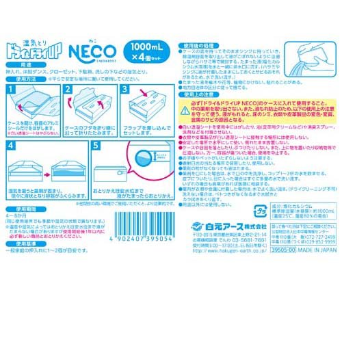 ★注目キャンペーン情報★ 商品情報商品詳細ドライ&ドライUP NECO●コンパクトな圧縮包装容器を採用。●湿気を吸ってぐんぐん膨らむ使い捨て貯水タイプの湿気とり。●プラスチック使用量を抑えた仕様で、使用後のゴミがかさばりにくいです。●押入れ、洋服ダンス、クローゼット、下駄箱、流しの下などの湿気とりに。●使用期間:4〜8か月(同じ使用場所でも季節や湿気の状態で異なります。)※湿度や湿気によっておとりかえ目安水位まで液がたまらない場合がありますが、使用開始後1年以内に必ず新しい商品とおとりかえください。使用方法・平らで安定な場所に置いて使用してください。1.ケースを開け、容器のアルミシールだけをはがします。※白い透湿シートはやぶらない。2.ケースのフタを折り線に沿って折りたたみます。3.フラップを差し込んでセットします。4.湿気を吸うと薬剤が固まり、徐々に液状となり容器がふくらみます。5.おとりかえ目安水位まで液がたまったらおとりかえ。★使用期間4〜8か月(同じ使用場所でも季節や湿気の状態で異なります。)※温度や湿気によってはおとりかえ目安水位まで液がたまらない場合がありますが使用開始後1年以内に必ず新しい商品とおとりかえください。成分塩化カルシウム注意事項★使用上の注意・必ず「ドライ&ドライUP NECO」のケースに入れて使用してください。・中の薬剤を取り出さないでください。・白い透湿シートを使用中にはがしたり、油(皮革用クリームなど)や消臭スプレー、洗剤などを付着させないようにしてください。・衣類や皮革製品が白い透湿シートに接触する場所には使用しないでください。・安定した場所で水平にして使い、倒れたまま放置しないでください。・ケースや容器を落としたり、ぶつけたりしないでください。また、上に物を置いたり収納物等で圧迫しないでください。万一、容器が傷ついた場合、使用を中止してください。・お子様やペットがいたずらしないようご注意ください。・直射日光の当たる場所で保管したり、使用しないでください。・薬剤の粒がなくなっても液はたまります。・薬剤を口にした場合は、水で口の中を洗浄し、コップ1〜2杯の水を飲ませてください。皮フについたり、目に入った場合はすぐに多量の水で洗い流してください。いずれの場合も異常があれば医師に相談してください。・薬剤が衣類や金属に付着した場合は、水でよく洗い流してください。(ドライクリーニング不可)洗えない場合は、ベトつきがなくなるまで水拭きとカラ拭きをくり返してください。・用途以外には使用しないでください。★使用後の処理・ケースの底を持ってそのままシンクに持っていき、除湿剤容器を取り出して液がこぼれないように注意しながらハサミ等で開封してください。たまった液(塩化カルシウム水溶液)を水と一緒に排水口に流してください(ハサミやシンクに液が付着したままにしておくとサビるおそれがありますので、水で洗い流してください。)・たまった液を植木や花等、植物にはかけないでください。枯れることがあります。・地方自治体の区分に従って捨ててください。原産国日本発売元、製造元、輸入元又は販売元白元アースお問い合わせ先白元アース株式会社東京都台東区東上野2-21-14お客様相談室:03-5681-7691受付時間9:00〜17:00(土、日、祝日を除く)広告文責楽天グループ株式会社 電話:050-5444-7654[除湿剤 防湿剤 乾燥剤 ドライ&ドライアップ]