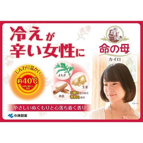 ★注目キャンペーン情報★ 商品情報商品詳細命の母カイロ 貼る(はる)タイプ●貼るタイプのカイロ。●よもぎ、生姜、肉桂の3種の抽出成分を配合した香料を使用しています。●やさしいぬくもりと心落ち着く香り。●最高温度57度●平均温度50度●12時間持続使用方法・この説明書きをよく読み、保管しておいてください。・使用直前に袋からカイロを取り出し、はく離シートをはがして肌に直接ふれないよう、もまずに衣類に貼って使用する。・貼る位置によっては、香りの感じ方が異なることがある。・カイロの表面をこすると、香り立ちが強くなる。・カイロや袋の内側に香料が白く付着していることがありますが、製品性能上問題はありません。・開封後残ったカイロはこの袋に入れて保存し早めに使う。・保存状態により、表示の持続時間に影響を与えることがある。原材料鉄粉、水、活性炭、吸水性樹脂、バーミキュライト、塩類、香料規格概要13cm*9.5cm注意事項★低温やけど防止のための注意・就寝時は使用しない。・布団の中や暖房器具の併用は高温になるため使用しない。・糖尿病など、温感および血行に障害のある方は使用しない。・幼児又は身体の不自由な方など本人の対応が困難な場合は保護者が注意する。・肌の弱い方は特に低温やけどに注意する。・肌に直接貼らない。・圧迫した状態で使用しない。・熱すぎると感じたときはすぐに使用を中止する。・万一やけどの症状があらわれた場合はすぐに使用を中止し、医師に相談する。★香り成分についての注意・香りで気分が悪くなった場合は使用を中止する。・肌に異常を感じた場合は直ちに使用を中止し、医師に相談する。★その他の注意・使用後は市区町村の区分に従って捨てる。・粘着剤で傷む衣類や高級な衣類には使用しない。・衣類よりはがすときは、不織布部をつままずに粘着剤のない部分に指をいれてゆっくりとはがす。・一部の保温性衣類では、カイロがつきにくいことがある。・小児、認知症の方などの誤食に注意する。・用途外には使用しない。★使用不可・就寝時・こたつ・ふとんの中・電気カーペット・ストーブ・暖房器具前・直射日光をさけ、涼しい所に保存する。・小児、認知症の方などの手の届くところに置かない。・使用後は市区町村の区分に従って捨てる。保存方法・直射日光をさけ、涼しい所に保存する。・小児、認知症の方などの手の届くところに置かない。原産国日本発売元、製造元、輸入元又は販売元小林製薬お問い合わせ先小林製薬株式会社〒541-0045 大阪市中央区道修町4-4-10お客様相談室 0120-5884-359:00-17:00(土・日・祝日を除く)広告文責楽天グループ株式会社 電話:050-5444-7654[温熱用品 命の母]