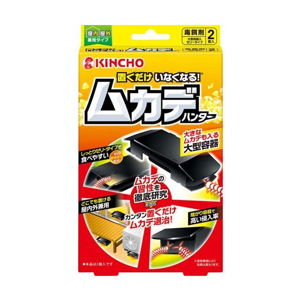 ★注目キャンペーン情報★ 商品情報商品詳細KINCHO 置くだけいなくなる ムカデハンター●置くだけ簡単!怖いムカデがいつのまにかいなくなる!ムカデ用の毒餌剤。●ムカデは狭くて暗いスキマが大好き!暗がり容器で高い侵入率!ムカデはしっとりしたものが大好き!しっとりゼリーをしっかり食べさせます。●大型容器で大きなムカデにも効く。●誤食を防ぐ容器採用。(使用環境により効果は異なります。)●どこでも置ける屋内外兼用●有効期間:約1ヵ月(使用状況により異なります)●適用害虫:ムカデ、ヤスデ、ダンゴムシ、ワラジムシ成分ジノテフラン注意事項・定められた使用方法をお守りください。・用途以外には使用しないでください。・容器の内容物を取り出さないでください。・本品は食べられません。万一誤って食べた場合は、本剤がジノテフラン(ネオニコチノイド系)を含有する殺虫剤であることを医師に告げて、診療を受けてください。・目に入らないように注意してください。万一、誤って入った場合は直ちに水で良く洗い、眼科医の手当てを受けてください。・皮膚についた場合は、石けんでよく洗ってください。・内容物がこぼれることがあるので容器を逆さにしないでください。・内容物が落下した場合は、直ちに拭き取ってください。・小児やペットが触れない場所に設置してください。・長時間水がたまるような場所を避けて設置してください。・使用済み本品は直接手を触れないようにしてください。・容器内にムカデが潜んでいる場合があります。・ご使用後は、自治体の指導に従って捨ててください。・できるだけ水平な場所に設置してください。・横向きや逆向きに設置しないでください。中の毒餌がこぼれる場合があります。保存方法直射日光、高温をさけ、小児の手の届かないところに保管してください。原産国日本発売元、製造元、輸入元又は販売元大日本除虫菊お問い合わせ先大日本除虫菊550-0001 大阪市西区土佐堀1-4-11お客様相談室06-6441-1105受付時間 9:00〜17:00(土・日・祝日を除く)広告文責楽天グループ株式会社 電話:050-5444-7654[殺虫剤 ]