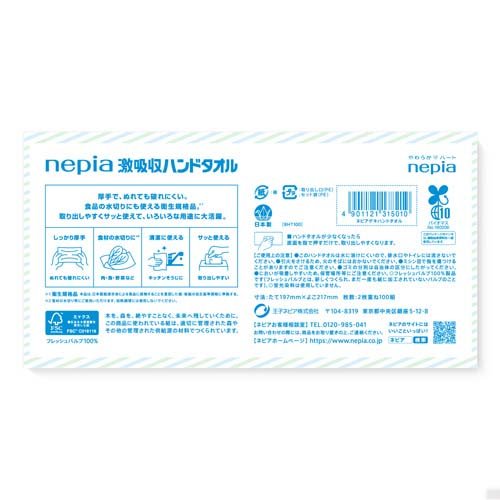 ★注目キャンペーン情報★ 商品情報商品詳細ネピア 激吸収ハンドタオル●ぬれても破れにくい厚手タイプ、2枚重ねのハンドタオルペーパーです。●食品の水切りにも使える衛生規格品。●フレッシュパルプ100%製品です。●FSC認証紙を使用。●取り出しやすく、サッと使えて便利なボックスタイプ。規格概要シートサイズ:197*217mm原材料:フレッシュパルプ100%注意事項・このハンドタオルは水に溶けにくいので、排水口やトイレには流さないでください。・引火をさけるため、火のそばにはおかないでください。・ミシン目で指に傷をつけることがありますのでご注意ください。・ゴミの分別は自治体の区分にしたがってください。・においが吸着しやすいため、保管場所等にご注意ください。・フレッシュパルプ100%製品です。(フレッシュパルプとは、新しくつくられ、まだ一度も紙に加工されていないパルプのことです。)・蛍光染料は使用していません。原産国日本発売元、製造元、輸入元又は販売元王子ネピア広告文責楽天グループ株式会社 電話:050-5444-7654[キッチン用品 ネピア(nepia)]