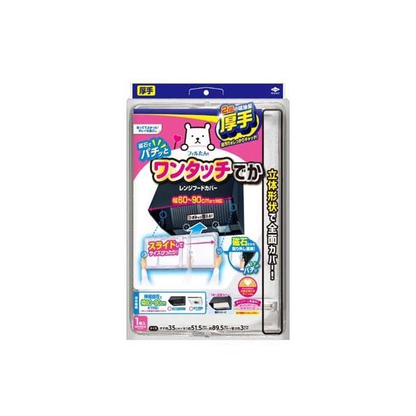 ★注目キャンペーン情報★ 商品情報商品詳細フィルたん スーパーワンタッチレンジフードカバーでか●吸油力が高い厚手フィルターを使用していますので、しっかり油汚れを防ぎ、長くお使いいただけます。●1枚で金属フィルターのつまみまでの全面をカバーし、油汚れを防ぎます。●最小51.5cmから最大89.5cmまで長さを調節できるので、60-90cmタイプの深型レンジフードなら1枚で使用できます。●取付け・取外しが簡単な磁石付きです。●フィルターが汚れたら交換お知らせサインが浮き出るので、取替え時期が一目でわかります。使用方法下図を参考に正しく取付けてください※89.5cm以上引き伸ばしますと、ストッパーが働き止まります。それ以上無理に引き伸ばしますと、製品が外れますのでご注意ください。深型レンジフードの場合1 厚みのある方を下向きにし、レンジフードの中に入れ、横幅に合わせて左右をひっぱりスライドさせてください。2 金属フィルターのつまみにかぶせるように製品を設置し、左右の磁石で取付けてください。交換お知らせサインがはっきり浮き出てきたら取替え時です。交換お知らせサインが消えかかってきましたら、レンジフード本体の性能に悪影響を及ぼすおそれがあります。※交換お知らせサインがアルミ枠と重なった場合は、浮き出ません。浅型レンジフードの場合(2枚必要です)全面がカバーできるように磁石をレンジフードの両端に取付けてください。厚みのある方を外側にします。セット詳細適合機種:レンジフード本体に磁石がつかないタイプには使用できません深型ブーツタイプ60-90cm金属フィルタータテ34-36cm 〇36cmより大きいサイズ 〇この製品を2枚ご使用いただくか、「大型レンジフードカバー浅・深兼用型」をご使用ください。34cm未満 ×「大型レンジフードカバー浅・深兼用型」をご使用ください。浅型タイプ60-90cm金属フィルタータテ34-36cm 〇この製品を2枚ご使用ください。Vキャッチタイプ金属フィルタータテ34-36cm ×排気口センター タイプ金属フィルタータテ34-36cm ×整流板付タイプ金属フィルタータテ34-36cm ×規格概要商品サイズ:タテ約35cm×ヨコ(最小)約51.5cm-(最大)約89.5cm×厚さ約3cm(最大部) 1枚入材質:アルミ枠/アルミニウムはく フィルター/難燃性不織布原産国:日本注意事項・縁部分は緑巻き加工をしていますが、設置する際や捨てる際には手を傷つけないようご注意ください。・レンジフードカバーの交換時は、次の2点を確認してください。(1)レンジフードのファンが完全に停止していること。(2)コンロの火が消えていること。・直接火のあたる場所では使用しないでください。・料理にブランデー・日本酒・みりん等のアルコール類を入れ、炎が高く上がる可能性がある場合には使用しないでください。穴があいたりフィルターに付着している飛沫油に引火するおそれがあります。・この製品は火災予防条例により、「ガスコンロ等の調理器具との距離を1m以上離して使用しなければならない」と定められています。これより短い距離では使用しないでください。・必ず備え付けの金属フィルターを取付けたままでご使用ください。備え付けの金属フィルターがない場合、フィルターが吸い込まれるおそれがありますので使用しないでください。・この製品は一般家庭用です。長時間使用される業務用等では使用しないでください。・約1ヶ月を目安に取替えてください。・レンジフードの形状により取付けできない機種があります。無理に取付けた場合、安全性またはレンジフード本来の性能を著しく損なうおそれがありますので、パッケージ記載事項をよく読んでからご使用ください。・交換お知らせサインが出ましたらお早めにお取替えください。汚れたままで使用されますとフィルターが目詰まりし、換気能力が落ちレンジフード本体の性能に悪影響を及ぼすおそれがあります。・ゴミとして処理する場合は、お住まいの自治体の区分に従ってください。・使用目的以外の使用はしないでください。原産国日本発売元、製造元、輸入元又は販売元東洋アルミエコープロダクツ広告文責楽天グループ株式会社 電話:050-5444-7654[キッチン用品 フィルたん]