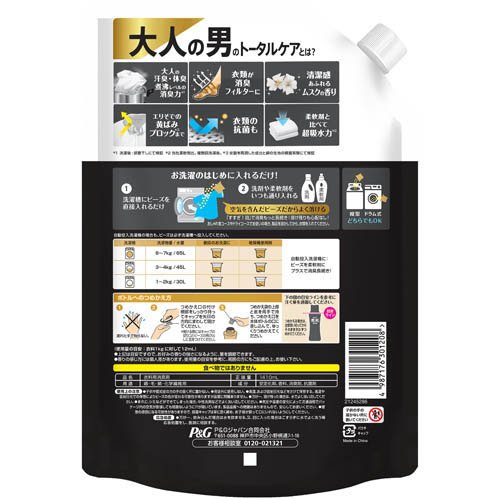 ★注目キャンペーン情報★ 商品情報商品詳細レノア 煮沸レベル超消臭 抗菌ビーズ MEN Fresh Musk 清潔感あふれるムスク 詰め替え●煮沸レベル消臭※1&さわやかムスクの香り●大人の男のトータルケア●柔軟剤と比べて超吸水力※2●スポーツの汗さらっと吸収※2●大人の汗臭・体臭●衣類が消臭フィルターに●エリそでの黄ばみブロック※3まで●衣類の抗菌も●お洗濯のはじめに入れるだけ!●縦型・ドラム式 どちらでもOK※1 洗濯後・部屋干しにて検証※2 メーカー柔軟剤比。複数回洗濯後。※3 皮脂を再現した成分と綿の生地の模擬実験にて検証●衣類専用香り付けビーズ使用方法・お洗濯のはじめに入れるだけ!1 洗濯槽にビーズを直接入れるだけ。2 洗剤や柔軟剤をいつも通り入れる。・空気を含んだビーズだからよく溶ける。・「すすぎ1回」で消臭もっと長続き!・溶け残りも心配なし!・おしゃれ着コースやドライコースでお使いの場合、製品を溶かしてから、衣類を入れてください。・自動投入洗濯機の場合も、ビーズは必ず洗濯槽へ投入してください。★自動投入洗濯機に・ビーズを柔軟剤にプラスで消臭長続き!★ボトルへのつめかえ方1濡れた手で触らない。2つめかえ口の付け根部をしっかり持ってキャップを矢印の方向にまわして開けてください。※開ける際にはキャップの切り口とビーズの飛び出しに気をつけてください。3つめかえ袋の上部と底を両手で持ち、つめかえ口を本体ボトルの口に差し込んで、ゆっくりつめかえてください。・つめかえる場合は、全部使い切ってからそのまま洗わずつめかえてください。(使用量の目安:衣料1kgに対して12mL)上記は目安ですので、お好みの香りの強さになるように、量を調節できます。成分安定化剤、香料、消臭剤、抗菌剤注意事項・香りの感じ方には個人差があります。・使用量の目安を参考に、周囲の方にもご配慮の上、お使い下さい。・食べ物ではありません。★使用上の注意・子供や認知症の方の手の届く所に置かない。・用途外に使用しない。・高温、および直射日光などをさけて保管する。・高温や直射日光での保管によりビーズの色が変わる可能性がありますが品質に問題ありません。・万が一、溶け残った場合は、水でよく洗い流してください。まれに、シミなどができてしまった場合、中性洗剤などでよく洗い流してください。・気圧や温度の変化によって流通過程でパッケージ内の空気が膨張しても問題ないように穴が開いています。・製品品質への問題はありませんので、安心してお使いください。・窒息の原因になる可能性がありますので、容器キャップは常に固く締め、お子様が誤って口にいれないようにしてください。★応急処置・万が一、飲み込んだ場合は水を飲ませる、又、目に入った場合はこすらずに水でよく洗う等応急処置をし、医師に相談する。原産国中国発売元、製造元、輸入元又は販売元P&G広告文責楽天グループ株式会社 電話:050-5444-7654[加香剤 レノア抗菌ビーズ]