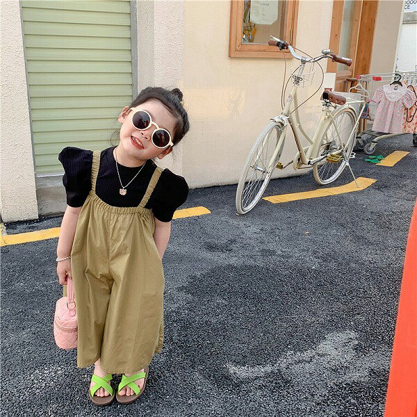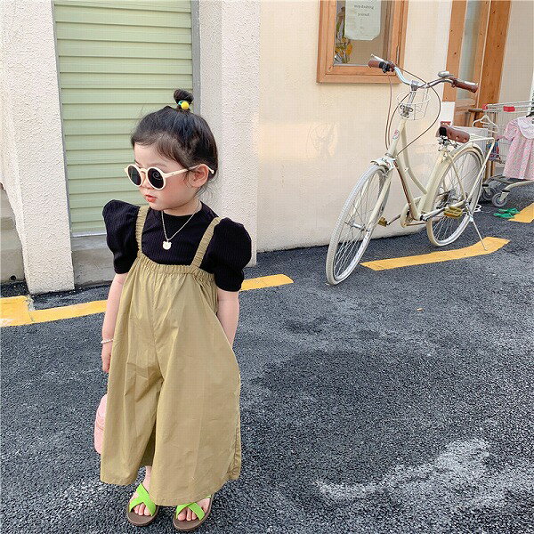 春夏新作 韓国風子供服 文芸風 サロペット 無地 サロペット ワイドパンツ 九分ズボン