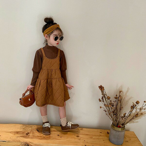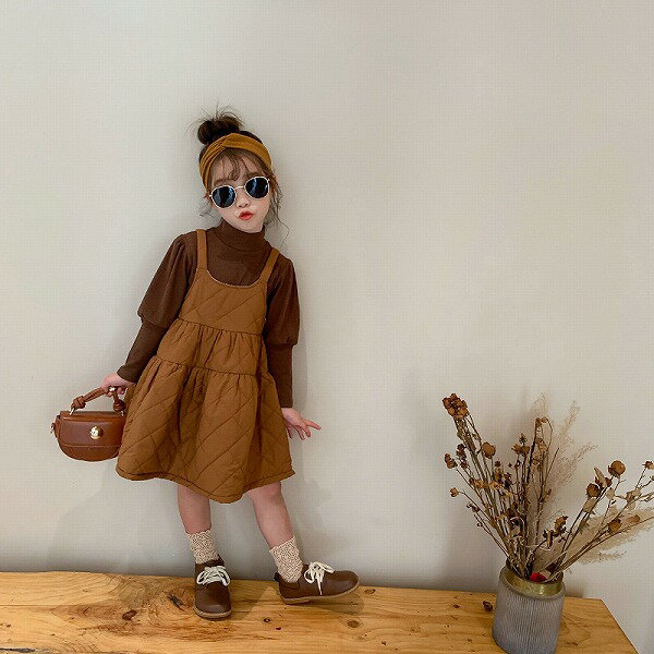 秋冬新作 韓国風 女の子 キッズ キルティング ワンピース ジャンパースカート set タートルネック