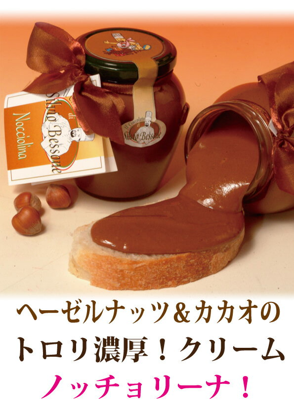 賞味期限:2024年3月31日 シルヴィオ・ベッソーネ商品一覧はこちらから 内容量:150g、 原産国:イタリア、 原材料名:ヘーゼルナッツ、砂糖、脱脂粉乳、カカオマス、カカオバター、乳化剤(大豆由来)、香料、保存方法:直射日光、高温多湿を避け涼しい場所に保存してください。 *高温で柔らかくなった後、冷えて固まると油脂分が上部に浮き分離することがあります。よく混ぜてお召し上がりいただければ、風味は劣りません。また、身体に差し障りありません。