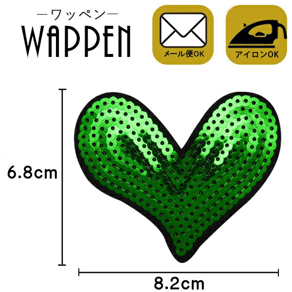 ワッペン スパンコール アイロン接着 縦6.8cm×横8.2cm グリーン ハート キラキラ デコ ダンス 入園 入学 アップリケ あっぷりけ wappen