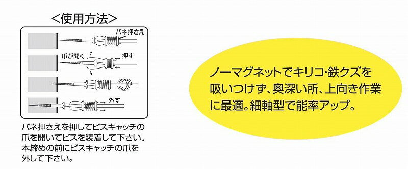 ●マグネットで保持できないネジ・ビスを爪でキャッチ! ●ノーマグネットでキリコ・鉄くずを吸いつけず、奥まった所や上向き作業に最適! ●細軸径で能率アップ。 ●14.4Vインパクト対応 【仕様】 ●軸径:4.3mm ●シャンク:6.35mm六角軸 ●全長:115mm ●材質:特殊高級鋼(全身焼入) メーカー:株式会社三共コーポレーション