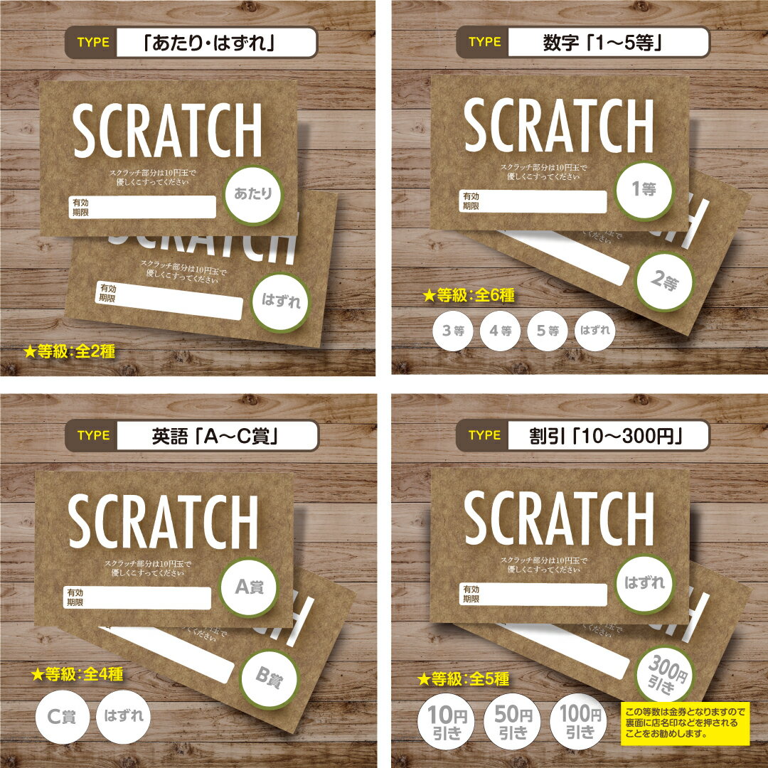 スクラッチカード スクラッチ 茶 有効期限 あたり はずれ 1 2 3 4 5 等 A B C 賞 10 50 300 円 割引 100枚 選べる カスタム オリジナル イベント 催事 販促 店舗 企画 キャンペーン セール パーティー くじ 抽選 自由 簡単 人気 おしゃれ 可愛い グッズ 小ロット メール便