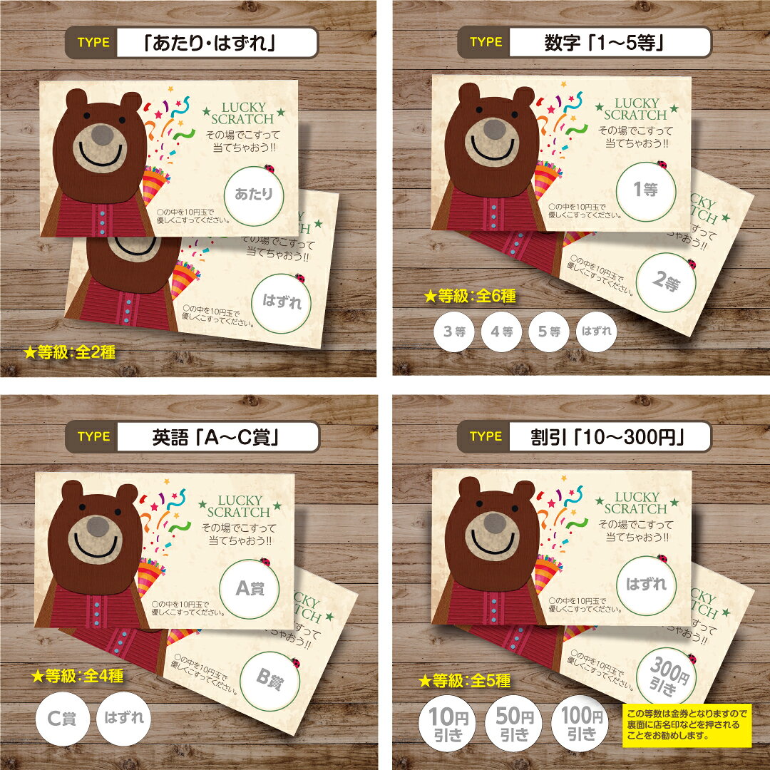 スクラッチカード スクラッチ 動物 くま かわいい あたり はずれ 1 2 3 4 5 等 A B C 賞 10 50 300 円 割引 100枚 選べる カスタム オリジナル イベント 催事 販促 店舗 企画 学祭 キャンペーン セール パーティ くじ 抽選 自由 簡単 グッズ 小ロット メール便