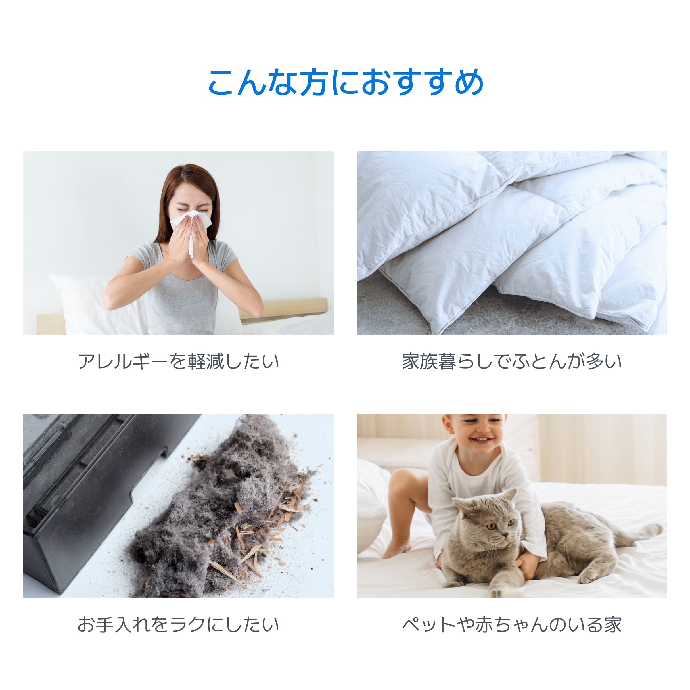 コードレス布団クリーナー オールシーズン大活躍する布団掃除機 コードレスだから布団だけではなくソファーやカーペットや車など様々なところの掃除ができます。 医師が開発した世界初のふとん掃除機 アレルゲン・菌を徹底除去 UV除菌・ウイルス除去・ダニ除去99.9% アレルギー症状を引き起こす原因を改善・予防できます。 くしゃみ・鼻水・目のかゆみなどの体の不調に役立ちます。 独自のクリーンケア UV除菌+たたきブラシ+吸引力の3つの力でダニとアレルゲン除去率99.9% UV LEDを使用することで従来のモデルより約6倍以上寿命が長くなりました。 高速に回転するたたきブラシはふとんの奥からダニやアレルゲンを取り除きます。 優れた操作性 可動ヘッドは手首に負担を減らし、重さを感じにくくします。 枕やソファーなどの曲線がある物も掃除がしやすいです。 壁際のゴミまで残さず吸引ができる設計 4重フィルター構造 ダストボックスの中には使い捨てフィルター、メタルフィルター、ファブリックフィルター、HEPAフィルターで構成され、空気まで清潔に。 使い捨てフィルターでゴミ捨てがより簡単になりました。 HEPAフィルターが0.3㎛の超微細なホコリも99.9%以上キャッチします。 大容量バッテリー 標準モードで約40分間使用ができるため、家中を掃除ができます。 バッテリーの残量を3段階で表示してくれます。 便利なUSB-Cタイプで充電が可能。 メンテナンス&収納 工具がなくてもブラシを取り外し、お手入れができます。 ダストボックス・メタルフィルター・ファブリックフィルターは水洗いができ、いつでも清潔に保つことができます。 自立収納ができるため、部屋のどこでもすっきり。 関連キーワード 布団クリーナー 布団掃除機 ダニ除去 ダニ退治 ハンディクリーナー