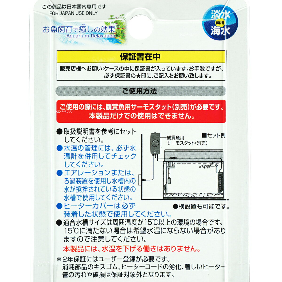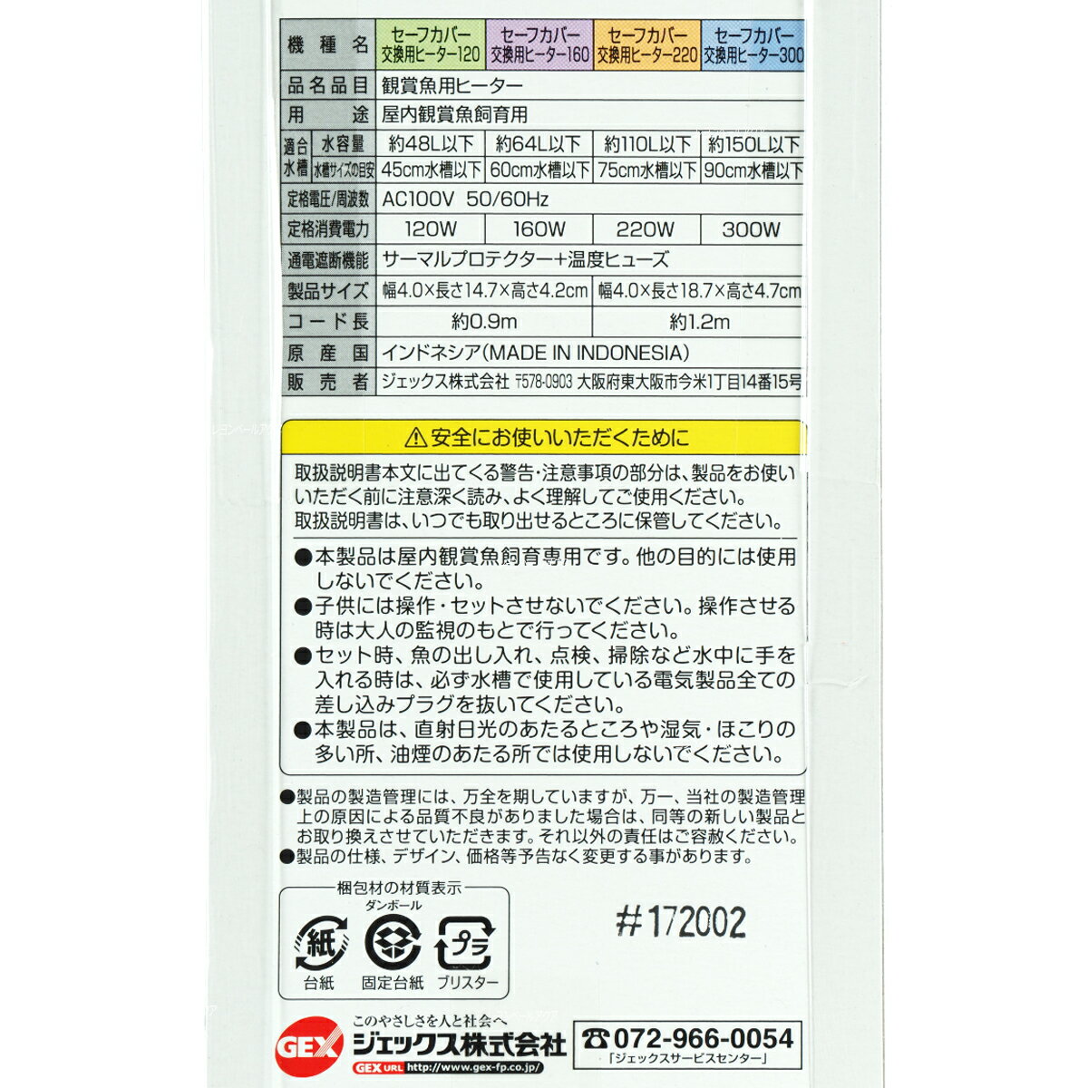 JAN: 4972547028952 「最短お届け日」でのお届け日を希望の場合、必ず「最短お届け日」を指定してください ※お届け日の指定がない注文は1-3日後の出荷となりますのでご注意ください。 ※追跡可能メール便の場合、最強翌日配送対象商品であってもお届け日を指定することはできません。 当店は39(サンキュー)ショップです 送料込みで3,980円以上送料無料 ※沖縄・離島・一部地域への配送は、9,800円(税込)以上で送料無料となります。 ■送料無料商品について 送料別の商品と一緒に注文された際も、購入金額が3980円(沖縄9800円)以上の場合は送料無料になります。 ・小型宅配便・宅配便(日本郵便) ※対面配達(受取サイン必要) ※簡易梱包にご協力お願いします。自動封函機梱包の為、大きめの箱にエアークッションで囲む梱包を基本とします。 ※複数注文の場合、複数倉庫から荷物をお届けする場合もあります。あらかじめご了承ください。 ※沖縄や離島の場合は1週間程かかる場合もあります。 ■注意事項 ・お互いにスムーズな取引の為、利用規約(会社概要)を必ずお読みください。 ・「最強配送」は日時指定必須です。必ず日時指定をしてください。指定がない場合は1-3日後の出荷となります。 ・リーズナブルな価格で販売していますが、商品はすべて新品になります。 ・キャンセルや返品は受け付けていませんので、返品商品などの再販は致しておりません。ご安心ください。 ・ 商品名にHz記載がある場合、50Hz、60Hzの間違いに気をつけてください。注文後の変更はできません。 ・注文後のお届け先住所変更や部屋番号などの記入漏れは有料で承ります。お間違い無きようご注文して下さい。 ・「不在配達通知書」が入った場合は、速やかに郵便局に連絡してください。 「不在配達通知書」の有無に関しては当社は一切関与いたしません。 ・3日以降配達されない場合は、発送通知の「お問い合わせ番号」を基に速やかに郵便局に連絡してください。再配達はお申し出がない限り行っていないようです。 ※通販取引に神経質な方、難癖付ける方、思い込みが激しい方、すぐに不安になられる方はご遠慮ください。 リーズナブルな価格でご提供するとともにスムーズな取引を心がけています。 ■商品説明※本製品は必ずサーモスタットに接続してご使用下さい。電源コード長 約0.9m空焚き防止機能付:空焚き見地温度センサー搭載し空気中での通電を感知するとヒーターカバー表面温度を安全な温度にコントロール。通電遮断機能:サーマルプロテクター+温度ヒューズ&難燃性樹脂安全カバー付■淡水・海水両用ジェックス株式会社072-966-0054■関連商品GEX NEWセーフカバーヒートナビ 80 4972547032805GEX NEWセーフカバーヒートナビ120 4972547032812GEX NEWセーフカバーヒートナビ160 4972547032829GEX NEWセーフカバーヒートナビ220 4972547032836GEX セーフカバーナビパック120 4972547028976GEX セーフカバーナビパック160 4972547028983GEX セーフカバーナビパック220 4972547028990GEX セーフカバーナビパック300 4972547029003GEX セーフカバー交換用ヒーター120 (緑) 4972547028921GEX セーフカバー交換用ヒーター160 4972547028938GEX セーフカバー交換用ヒーター220 4972547028945GEX セーフカバー交換用ヒーター300 4972547028952 安全を追求した独自の【シャトル構造】を採用。空焚き検知温度センサーを搭載、空気中での通電を感知するとヒーターカバー表面温度を安全な温度にコントロールします。温度ヒューズを作動させる前に通電を遮断するので、再使用が可能です。難燃性樹脂を使用したヒーターカバーがついているので、人にも、魚にも安全です。アクアリウム用品|ヒーター サーモ|交換用ヒーターSP規格ジェックス 交換ヒーター