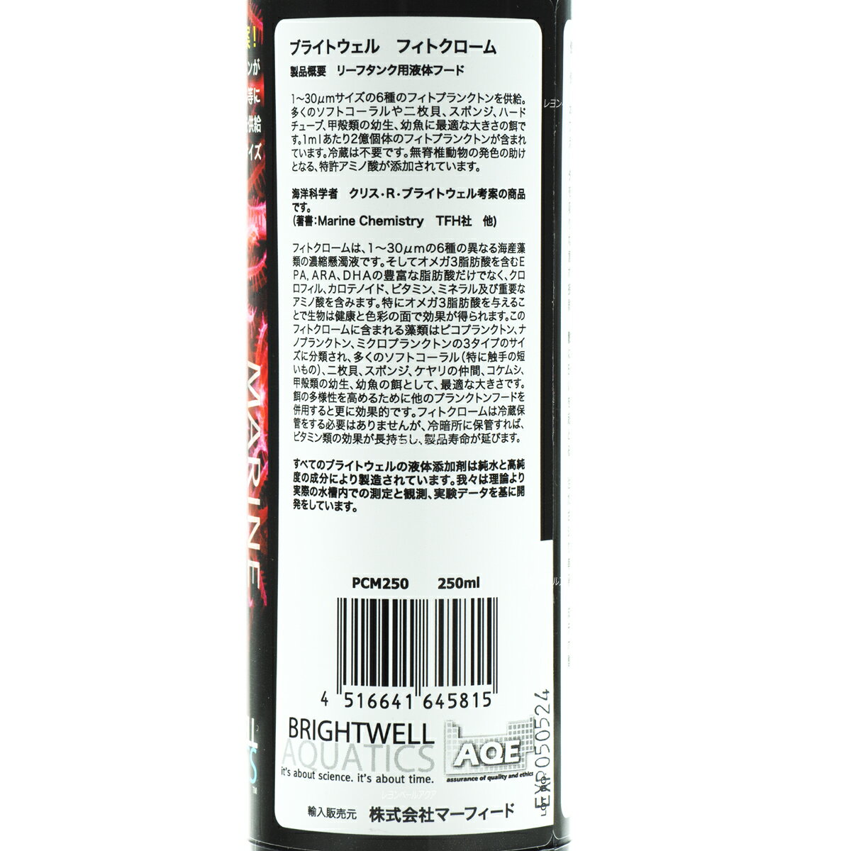 JAN: 4516641645815賞味期限 品質保持期限: 2028/01/26 「最短お届け日」でのお届け日を希望の場合、必ず「最短お届け日」を指定してください ※お届け日の指定がない注文は1-3日後の出荷となりますのでご注意ください。 ※追跡可能メール便の場合、最強翌日配送対象商品であってもお届け日を指定することはできません。 当店は39(サンキュー)ショップです 送料込みで3,980円以上送料無料 ※沖縄・離島・一部地域への配送は、9,800円(税込)以上で送料無料となります。 ■送料無料商品について 送料別の商品と一緒に注文された際も、購入金額が3980円(沖縄9800円)以上の場合は送料無料になります。 ・小型宅配便・宅配便(日本郵便) ※対面配達(受取サイン必要) ※簡易梱包にご協力お願いします。自動封函機梱包の為、大きめの箱にエアークッションで囲む梱包を基本とします。 ※複数注文の場合、複数倉庫から荷物をお届けする場合もあります。あらかじめご了承ください。 ※沖縄や離島の場合は1週間程かかる場合もあります。 ■注意事項 ・お互いにスムーズな取引の為、利用規約(会社概要)を必ずお読みください。 ・「最強配送」は日時指定必須です。必ず日時指定をしてください。指定がない場合は1-3日後の出荷となります。 ・リーズナブルな価格で販売していますが、商品はすべて新品になります。 ・キャンセルや返品は受け付けていませんので、返品商品などの再販は致しておりません。ご安心ください。 ・ 商品名にHz記載がある場合、50Hz、60Hzの間違いに気をつけてください。注文後の変更はできません。 ・注文後のお届け先住所変更や部屋番号などの記入漏れは有料で承ります。お間違い無きようご注文して下さい。 ・「不在配達通知書」が入った場合は、速やかに郵便局に連絡してください。 「不在配達通知書」の有無に関しては当社は一切関与いたしません。 ・3日以降配達されない場合は、発送通知の「お問い合わせ番号」を基に速やかに郵便局に連絡してください。再配達はお申し出がない限り行っていないようです。 ※通販取引に神経質な方、難癖付ける方、思い込みが激しい方、すぐに不安になられる方はご遠慮ください。 リーズナブルな価格でご提供するとともにスムーズな取引を心がけています。 ■商品説明6種のフィトプランクトンがソフトコーラル等に必須脂肪酸を供給します。1μmから30μmサイズの6種のフィトプランクトンを供給。多くのソフトコーラルや二枚貝、スポンジ、ハードチューブ、甲殻類の幼生、幼魚に最適な大き さの餌です。1mlあたり2億個体のフィトプランクトンが含まれています。冷蔵は不要です。無脊椎動物の発色の助けとなる特許アミノ酸が添加されていま す。※キャップの構造上、輸送中多少の液漏する場合があります。予めご了承ください。株式会社マーフィード045-228-1180■関連商品ブライトウェル PHプラス 250ml 4516641647451ブライトウェル アイオディオン 250ml 4516641645761ブライトウェル アイオディオン 500ml 4516641646614ブライトウェル アルカリン8.3 250ml 4516641647468ブライトウェル エンジェリクサー 125ml 4516641647499ブライトウェル フィトクローム 250ml 4516641645815ブライトウェル フェリオン 500ml 4516641647093ブライトウェル マグネシオン 500ml 4516641646591ブライトウェル リキッドリーフ 250ml 4516641645730ブライトウェル リプレニッシュ 250ml 4516641645754海水魚用品|餌えさ|ブライトウェルマーフィード 海水魚の餌 サンゴフード コーラルフード サンゴ用液体フード フード