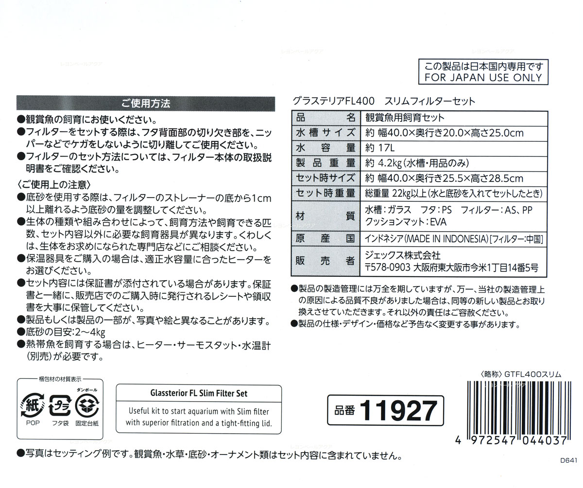 JAN: 4972547044037 「最短お届け日」でのお届け日を希望の場合、必ず「最短お届け日」を指定してください ※お届け日の指定がない注文は1-3日後の出荷となりますのでご注意ください。 ※追跡可能メール便の場合、最強翌日配送対象商品であってもお届け日を指定することはできません。 当店は39(サンキュー)ショップです 送料込みで3,980円以上送料無料 ※沖縄・離島・一部地域への配送は、9,800円(税込)以上で送料無料となります。 ■配送について ・宅配便(日本郵便) ゆうパック お急ぎの方!! 選べる「最短お届け日」 ※簡易梱包にご協力お願いします。自動封函機梱包の為、大きめの箱にエアークッションで囲む梱包を基本とします。 ※複数注文の場合、複数倉庫から荷物をお届けする場合もあります。あらかじめご了承ください。 ※沖縄や離島の場合は1週間程かかる場合もあります。 ■注意事項 ・お互いにスムーズな取引の為、利用規約(会社概要)を必ずお読みください。 ・「最強配送」は日時指定必須です。必ず日時指定をしてください。指定がない場合は1-3日後の出荷となります。 ・リーズナブルな価格で販売していますが、商品はすべて新品になります。 ・キャンセルや返品は受け付けていませんので、返品商品などの再販は致しておりません。ご安心ください。 ・ 商品名にHz記載がある場合、50Hz、60Hzの間違いに気をつけてください。注文後の変更はできません。 ・注文後のお届け先住所変更や部屋番号などの記入漏れは有料で承ります。お間違い無きようご注文して下さい。 ・「不在配達通知書」が入った場合は、速やかに郵便局に連絡してください。 「不在配達通知書」の有無に関しては当社は一切関与いたしません。 ・3日以降配達されない場合は、発送通知の「お問い合わせ番号」を基に速やかに郵便局に連絡してください。再配達はお申し出がない限り行っていないようです。 ※通販取引に神経質な方、難癖付ける方、思い込みが激しい方、すぐに不安になられる方はご遠慮ください。 リーズナブルな価格でご提供するとともにスムーズな取引を心がけています。 ■商品説明このフレームレス水槽セットは、「コーナークリア製法」で水景を美しく際立たせます。静音のDC-Xポンプ搭載スリムフィルターや専用フタが付属し、すっきりとしたデザインを実現。透明感あふれるクリアシリコン仕上げで、インテリアにも最適です。水槽サイズ: 約W40×D20×H25cm、水容量: 約17L、ガラス厚: 4mmセット内容: ガラス水槽、スリムフィルターDC-X S2、フタ、クッションマット、カルキぬき、水質調整剤特長: 「コーナークリア製法」による透明感、美しいガラスの貼り合わせ、専用フタ付きでLEDライト設置可能【注意】クリアLEDフラッティ3040は別売です。ジェックス株式会社072-966-0054■関連商品GEX グラステリア 300 キューブ スリムフィルターセット 4972547044082GEX グラステリア 450 スリム スリムフィルターセット 4972547044099GEX グラステリア 600スリム スリムフィルターセット4972547044105GEX グラステリア FL200 サイレントフローセット 4972547044051GEX グラステリア FL200 スリムフィルターセット 4972547044013GEX グラステリア FL300 スリムフィルターセット 4972547044020GEX グラステリア FL400 スリムフィルターセット 4972547044037GEX サイレントフィット アルファ300水槽セット サイレントフロースリムホワイト付属 4972547041210GEX サイレントフィット アルファ500水槽セット 4972547041227GEX サイレントフィット アルファ600水槽セット 4972547041234GEX デスクボーイホワイト WH600 5点水槽セット 4972547031273GEX メダカ元気 メダカのための水槽セット 200CUBE 4972547041647GEX メダカ元気 メダカのための水槽セット300 4972547041654GEX メダカ元気 メダカのための水槽セット400 4972547041661GEX 金魚元気 キューブセット 200 4972547032003GEX 水槽セット スリムアクアセット3004972547044129GEX 水槽セット スリムアクアセット400 DC-X S24972547044136GEX 水槽セット スリムアクアセット500 DC-X M3 4972547044143GEX 水槽セット ラクフィル水換え簡単セット 400WH 4972547040329 水槽サイズ 約幅40cm×奥行20cm×高さ25cm 水容量 約17L セット内容 ガラス水槽、スリムフィルターDC-X S2、フタ、クッションマット、カルキぬき、水質調整剤 対応商品 スリムマット各種 ガラス厚 4mmアクアリウム用品|水槽|水槽セットGEX, グラステリア, FL400, スリムフィルター, フレームレス, DC-Xポンプ, 省エネ, 静音, 透明度高い, 観賞魚, 水草