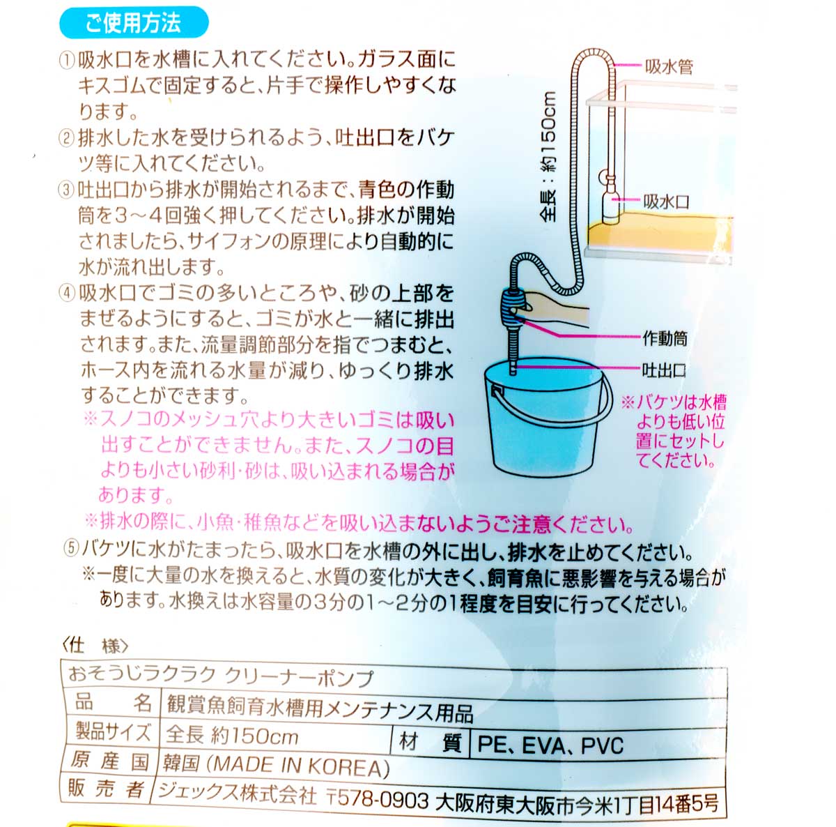 JAN: 4972547036452 「最短お届け日」でのお届け日を希望の場合、必ず「最短お届け日」を指定してください ※お届け日の指定がない注文は1-3日後の出荷となりますのでご注意ください。 ※追跡可能メール便の場合、最強翌日配送対象商品であってもお届け日を指定することはできません。 当店は39(サンキュー)ショップです 送料込みで3,980円以上送料無料 ※沖縄・離島・一部地域への配送は、9,800円(税込)以上で送料無料となります。 ■送料無料商品について 送料別の商品と一緒に注文された際も、購入金額が3980円(沖縄9800円)以上の場合は送料無料になります。 ・小型宅配便・宅配便(日本郵便) ※対面配達(受取サイン必要) ※簡易梱包にご協力お願いします。自動封函機梱包の為、大きめの箱にエアークッションで囲む梱包を基本とします。 ※複数注文の場合、複数倉庫から荷物をお届けする場合もあります。あらかじめご了承ください。 ※沖縄や離島の場合は1週間程かかる場合もあります。 ■注意事項 ・お互いにスムーズな取引の為、利用規約(会社概要)を必ずお読みください。 ・「最強配送」は日時指定必須です。必ず日時指定をしてください。指定がない場合は1-3日後の出荷となります。 ・リーズナブルな価格で販売していますが、商品はすべて新品になります。 ・キャンセルや返品は受け付けていませんので、返品商品などの再販は致しておりません。ご安心ください。 ・ 商品名にHz記載がある場合、50Hz、60Hzの間違いに気をつけてください。注文後の変更はできません。 ・注文後のお届け先住所変更や部屋番号などの記入漏れは有料で承ります。お間違い無きようご注文して下さい。 ・「不在配達通知書」が入った場合は、速やかに郵便局に連絡してください。 「不在配達通知書」の有無に関しては当社は一切関与いたしません。 ・3日以降配達されない場合は、発送通知の「お問い合わせ番号」を基に速やかに郵便局に連絡してください。再配達はお申し出がない限り行っていないようです。 ※通販取引に神経質な方、難癖付ける方、思い込みが激しい方、すぐに不安になられる方はご遠慮ください。 リーズナブルな価格でご提供するとともにスムーズな取引を心がけています。 ■商品説明GEX おそうじラクラク クリーナーポンプは、水槽のお手入れを簡単にする便利なアイテムです。手軽に水換えや底砂の掃除ができ、初心者でも扱いやすい設計です。吸引力が強く、短時間で効率よく作業が進みます。コンパクトで収納も簡単です。・手軽に水換えや底砂の掃除ができる・初心者でも扱いやすい設計・強力な吸引力で効率よく作業可能・コンパクトで収納が簡単・耐久性があり長持ちジェックス株式会社072-966-0054■関連商品GEX おそうじラクラク クリーナーポンプ 4972547036452GEX おそうじラクラク クリーナーポンプ パイプ付 4972547036469GEX おそうじラクラク水換えポンプ 淡水・海水両用 4972547039156GEX そうじやさん(新パッケージ)4972547036537GEX そうじやさん用ネット GX37 4972547255723GEX 水換えお掃除用品 マスタークリアL4972547043696GEX 水換えお掃除用品 マスタークリアM 4972547043689GEX 水換えお掃除用品 マスタークリアS 4972547043672アズージャパン OISTA ホースキープ君 4580163200463ニッソー 自動給水器 水足しくん NAG1854975637527618水作 クイック水替えポンプ Big PH-78 4974105005788水作 プロホース エクストラ L PH82 4974105005825水作 プロホース エクストラ M PH81 4974105005818水作 プロホース エクストラ S PH80 4974105005801水作 プロホース エクストラM/L用 ストレーナー弁セット 4974105005641水作 プロホース エクストラS用 ストレーナー弁セット 4974105005634水作 プロホース エクストラ用 スターターポンプ (キャップ付) 4974105005603水作 水換えらくらく プロクリーナー 4974105004910水作 水換えらくらく プロクリーナー ロング 4974105005009アクアリウム用品|メンテ用品|水換え用品