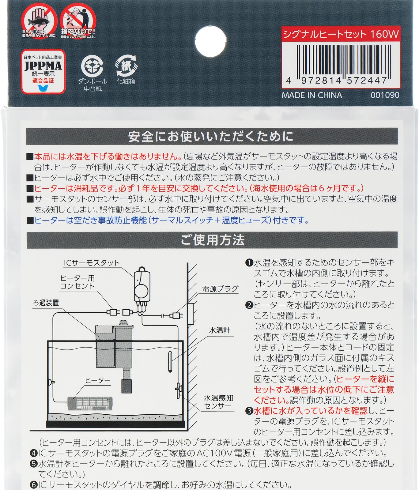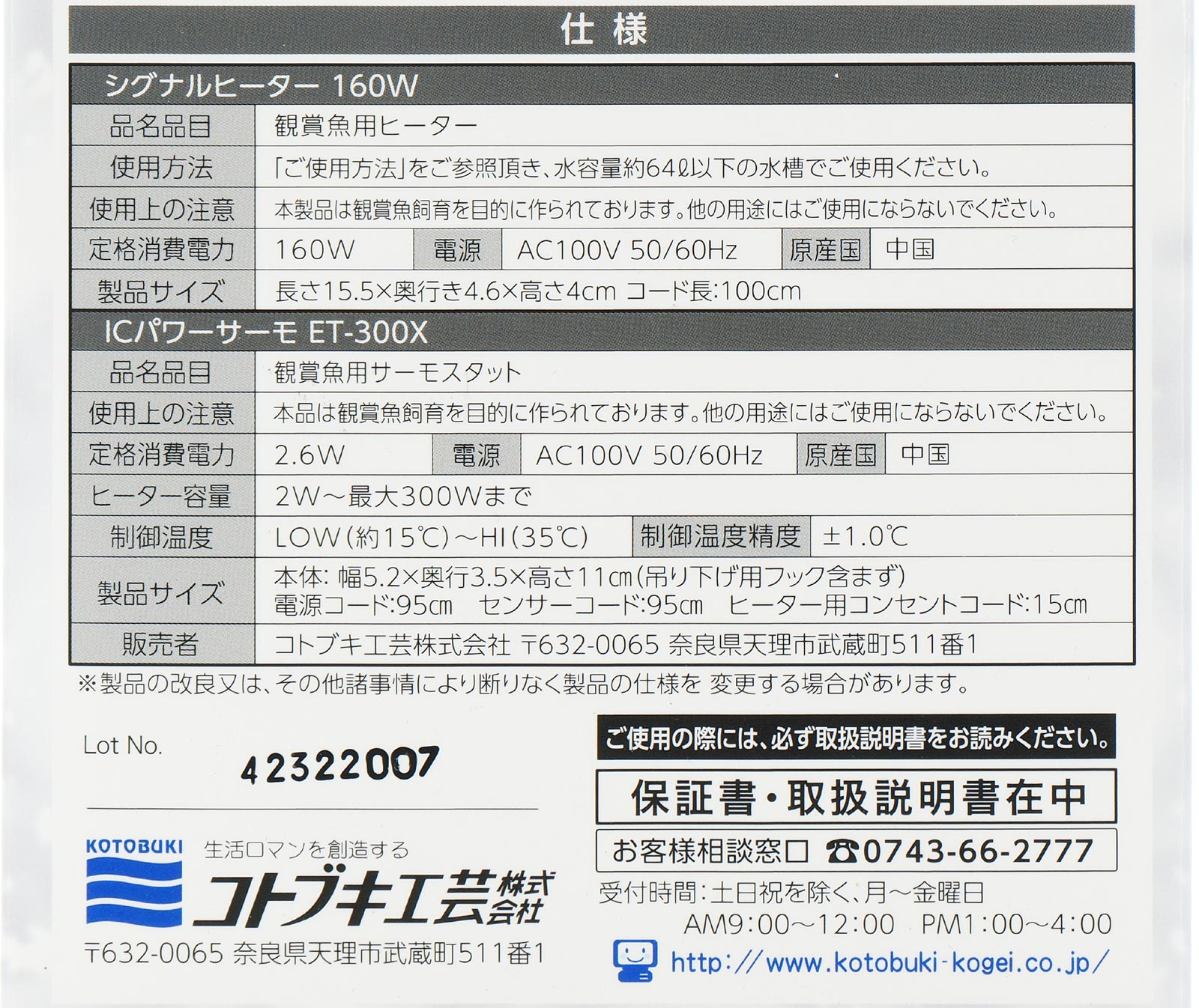 JAN: 4972814572447 「最短お届け日」でのお届け日を希望の場合、必ず「最短お届け日」を指定してください ※お届け日の指定がない注文は1-3日後の出荷となりますのでご注意ください。 ※追跡可能メール便の場合、最強翌日配送対象商品であってもお届け日を指定することはできません。 当店は39(サンキュー)ショップです 送料込みで3,980円以上送料無料 ※沖縄・離島・一部地域への配送は、9,800円(税込)以上で送料無料となります。 ■送料無料商品について 送料別の商品と一緒に注文された際も、購入金額が3980円(沖縄9800円)以上の場合は送料無料になります。 ・小型宅配便・宅配便(日本郵便) ※対面配達(受取サイン必要) ※簡易梱包にご協力お願いします。自動封函機梱包の為、大きめの箱にエアークッションで囲む梱包を基本とします。 ※複数注文の場合、複数倉庫から荷物をお届けする場合もあります。あらかじめご了承ください。 ※沖縄や離島の場合は1週間程かかる場合もあります。 ■注意事項 ・お互いにスムーズな取引の為、利用規約(会社概要)を必ずお読みください。 ・「最強配送」は日時指定必須です。必ず日時指定をしてください。指定がない場合は1-3日後の出荷となります。 ・リーズナブルな価格で販売していますが、商品はすべて新品になります。 ・キャンセルや返品は受け付けていませんので、返品商品などの再販は致しておりません。ご安心ください。 ・ 商品名にHz記載がある場合、50Hz、60Hzの間違いに気をつけてください。注文後の変更はできません。 ・注文後のお届け先住所変更や部屋番号などの記入漏れは有料で承ります。お間違い無きようご注文して下さい。 ・「不在配達通知書」が入った場合は、速やかに郵便局に連絡してください。 「不在配達通知書」の有無に関しては当社は一切関与いたしません。 ・3日以降配達されない場合は、発送通知の「お問い合わせ番号」を基に速やかに郵便局に連絡してください。再配達はお申し出がない限り行っていないようです。 ※通販取引に神経質な方、難癖付ける方、思い込みが激しい方、すぐに不安になられる方はご遠慮ください。 リーズナブルな価格でご提供するとともにスムーズな取引を心がけています。 ■商品説明コトブキ工芸の「シグナルヒートセット160W」は、60cm水槽に適したヒーターとサーモスタットのセットです。高性能IC制御により水温の変動を抑え、正確な温度管理が可能です。保温のON/OFFが一目でわかるシグナルランプと難燃性カバーを備え、安全性にも配慮されています。サーモスタットは15℃から35℃までの幅広い温度設定が可能で、大型ダイヤルで簡単に操作できます。・高性能IC制御で安定した水温管理 ・保温状態を示すシグナルランプ搭載 ・難燃性カバーで安全性を確保 ・15℃~35℃の広範な温度設定が可能 ・大型ダイヤルで直感的な操作性注意:本製品は観賞魚専用です。他の目的には使用しないでください。ヒーターは消耗品のため、1年を目安に交換してください。おすすめポイント:高性能IC制御と安全設計で、安心して水槽の温度管理が可能です。寿(コトブキ)工芸株式会社0743-66-2777■関連商品コトブキ シグナルオート 60W 4972814572294コトブキ シグナルオート 80W 4972814572300コトブキ シグナルオート 120W 4972814572317コトブキ シグナルオート 160W 4972814572324コトブキ シグナルオート 220W 4972814572331コトブキ シグナルオートMD ヒーター 120W 4972814572409コトブキ シグナルオートMD ヒーター 160W 4972814572416コトブキ シグナルオートMD ヒーター 220W 4972814572423コトブキ シグナルヒートセット 120W 4972814572430コトブキ シグナルヒートセット 160W 4972814572447コトブキ シグナルヒートセット 220W 4972814572454コトブキ シグナルヒートセット 300W 4972814572461コトブキ シグナルヒーター 120W 4972814572348コトブキ シグナルヒーター 160W 4972814572355コトブキ シグナルヒーター 220W 4972814572362コトブキ シグナルヒーター 300W 4972814572379 製品名 コトブキ シグナルヒートセット 160W JANコード 4972814572447 定格電圧 AC100V 定格周波数 50/60Hz 定格消費電力 160W 水温制御温度 15〜35℃ 温度精度 ±1℃ 適合水量 約64L以下 適合水槽サイズ 幅60cm以下 ヒーター本体サイズ 長さ15.5cm×奥行き4.6cm×高さ4cm ヒーターコード長 約100cm サーモスタット本体サイズ 幅5.2cm×奥行き3.5cm×高さ11cm サーモスタット電源コード長 約95cm 設置方法 縦置き・横置き両対応 対応水質 海水・淡水両用アクアリウム用品|ヒーター サーモ|ヒーターサーモスタットコトブキ工芸、シグナルヒートセット、160W、60cm水槽、ヒーター、サーモスタット、アクアリウム、熱帯魚、温度管理、安全設計