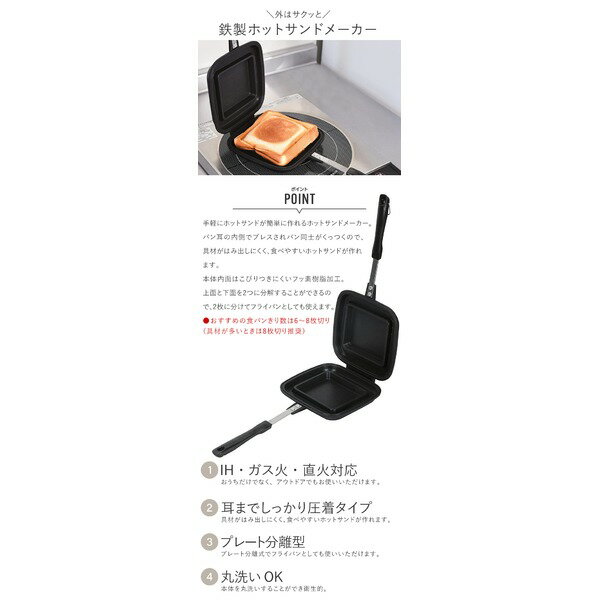 ■商品内容お好みの具を挟んで焼くだけで、カフェ風の具沢山ホットサンドが簡単に作れるホットサンドメーカー。パン耳の内側でプレスされパン同士がくっつくので、具材がはみ出しにくく、食べやすいホットサンドが作れます。本体内面はこびりつきにくいフッ素樹脂加工でお手入れも簡単。上面と下面を2つに分解することができるので、2枚に分けてフライパンとしても使えます。●おすすめの食パン切り数は6〜8枚切り(具材が多いときは8枚切り推奨)■商品スペック【サイズ(約)】全長38.5×幅17×高さ4cm【重量(約)】1.15kg【素材・材質】本体:アルミニウム合金、はり底:ステンレス鋼取っ手:フェノール樹脂(耐熱温度150度)止め具:ステンレス鋼【表面加工】ふっ素樹脂塗膜加工【熱源】IHクッキングヒーター・ガス火対応【分解(着脱)】可能(2枚のフライパンとして使用可能)【おすすめシーン】アウトドア・キャンプ・BBQ 朝食・おやつ・夜食など【注意事項】・オーブン、電子レンジには使用しないでください。・つけ置き洗いや食器洗い乾燥機には使用しないでください。【原産国】中国【同シリーズ】●フッ素加工IHホットサンドトースター●フッ素加工ツインホットサンドトースターフッ素加工ワッフルメーカー※このページは「フッ素加工IHホットサンドトースター」を販売しております。■送料・配送についての注意事項●本商品の出荷目安は【2 - 6営業日 ※土日・祝除く】となります。●お取り寄せ商品のため、稀にご注文入れ違い等により欠品・遅延となる場合がございます。●本商品は仕入元より配送となるため、沖縄・離島への配送はできません。[ D-6693 ]