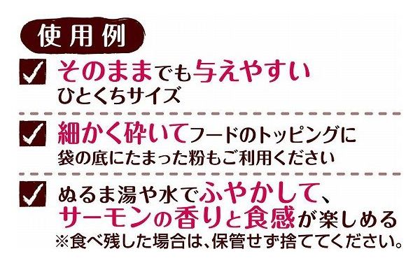 【商品説明】素材そのままの美味しさが味わえ、様々な目的に合わせてアレンジできるフリーズドライです。・そのままでも与えやすいひとくちサイズ。・細かく砕いてフードのトッピングに。(※袋の底にたまった粉もご利用ください。)・ぬるま湯や水でふやかすと、幼猫やシニア猫にも食べやすくなります。・保存料・着色料 無添加。○原材料サーモン○賞味/使用期限(未開封)18ヶ月※仕入れ元の規定により3ヶ月以上期限の残った商品のみ出荷致します○保管方法※直射日光・高温多湿の場所をさけて保存してください。※本品は水分を吸収しやすい性質を持っているため、開封後は必ずチャックを閉じて冷暗所で保存し、なるべく早くお与えください。○原産国中国○メーカー名株式会社 ペティオ【取り寄せ品のご注意事項(ご注文前にご確認ください)】・本商品は原則注文後のキャンセルはお受けできません。・本商品と他商品で同梱注文をいただき、仮に他商品が完売等でご用意できない場合でも本商品は発送させていただきます。・本商品を複数(2点以上)注文いただき、完売等で注文数のご用意できない場合でもご用意できた数量は発送させていただきます。【送料について】北海道、沖縄、離島は送料を頂きます。