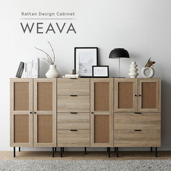 ■サイズ・色違い・関連商品■トールキャビネット 幅60cm■チェストキャビネット 幅60cm■チェストキャビネット 幅72cm[当ページ]関連商品の検索結果一覧はこちら■商品内容※こちらは「チェストキャビネット 幅72cm」の販売ページになります。Rattan Design CabinetWEAVA・ラタン調のお洒落なデザイン 木目柄とラタン調の扉が特徴の大人デザイン。 黒スチールをあしらうことで、洗練された印象を。・使いやすく設計された収納力 可動棚付きの扉収納と、引き出し収納付きだから、 分別しながら色々なものが収納可能。・様々なシーンに溶け込む 圧迫感のないサイズ感なので、どんな場所にも馴染みやすく、 空間を素敵に演出してくれます。■3Type・チェストキャビネット W60:可動棚1枚、引き出し2杯・チェストキャビネット W72:可動棚2枚、固定棚1枚、引き出し4杯・トールキャビネット W60:可動棚4枚、固定棚1枚■ラタン調をアクセントとした異素材デザイン 本物のような木目柄と、ラタン調の扉が特徴の大人デザインなキャビネット。 取っ手と脚に黒スチールをあしらうことで、洗練された印象を。■本物に近いラタン調の素材を使用 天然素材のようなラタン調の扉は、ナチュラルでこなれ感のある雰囲気。 お手入れを手軽にするため、本物のラタンではなく、ポリエチレンを使用しました。・伝統的なカゴメ編み 「カゴメ編み」という方法で編まれた抜け感のある扉。■スマートさを感じるスリットデザイン キャビネットの顔となる扉のデザインにも細かい工夫を施しました。 ラタン調以外の扉は、スマートさと軽やかなリズム感のあるスリットデザインです。■圧迫感を感じにくいサイズ感 置く場所を選ばず、どんな空間にも馴染むサイズに設計。 高さもちょうどよく、天板の上はディスプレイスポットとしても。・幅72×高さ102cm■様々なシーンに素敵に馴染む・リビング シリーズで並べて使っても・寝室 寝室のちょっとしたアクセントに・キッチン キッチン収納として使っても・クローゼット 洋服や下着、アクセサリーなどの収納に■使いやすく設計された収納力 棚付きの扉収納と、4杯の引き出し収納付きだから、 分別しながら色々なものが収納できます。 可動棚2枚/固定棚1枚/引き出し収納4杯・扉収納 固定棚1枚・可動棚が2枚付きます。 本や、高さのある小物収納に便利です。 可動棚は、3cmピッチで高さ調整可能・引き出し収納 引き出し収納4杯付きで、細々した小物類をすっきりと収納できます。 出し入れしやすいスライドレール■リアルな木目・高強度なメラミン化粧板仕様 本物のような木目柄のメラミン樹脂加工板を採用。 安価な紙張りの合板よりも水、キズ、汚れに強く、 耐傷、耐水性が求められるカウンター天板などに多く使われています。■マットな質感の取っ手と脚 脚と取っ手は、マットな質感が特徴のスチール製。 ブラックカラーがナチュラルな雰囲気の中にもクールな印象をプラスします。・脚はアジャスター付き がたつきを調整するアジャスター付き。 床への傷付き防止にも。■細部にもこだわりを・背面化粧仕上げ 背面は清潔感のある化粧仕上げ。 レイアウトの自由度も広がります。・横揺れ防止パーツ 本体の横揺れを防止するパーツ付き。 横揺れ軽減により使用感もアップします。■シリーズで揃えて統一感のある部屋に 同じシリーズのテレビ台と合わせれば、統一感のあるお洒落なインテリアへ 120cm/150cm/180cm■組み立てについて こちらは組み立てにお時間をいただく商品です。 必要工具:プラスドライバー、マイナスドライバー ※あると作業がしやすいもの:電動ドライバー、ゴムハンマー 1.引き出し収納をそれぞれ組み立てます。 2.背面に側板などを取り付けます。 3.2に天板、底板を取り付けます。 4.3に脚を取り付けます。 5.1で組み立てた引き出し収納と扉を取り付けます。 6.完成です。■商品スペック■サイズ(約)チェストキャビネット幅60cm:幅60×奥行40×高さ102cmチェストキャビネット幅72cm:幅72×奥行40×高さ102cmトールキャビネット幅60cm:幅60×奥行40×高さ102cm脚の高さ:14cm(共通)■材質メラミン化粧板、パーティクルボード、MDF、スチール(粉体塗装)■耐荷重(約)・チェストキャビネット幅60cm 天板:10kg、可動棚:2kg、固定棚:5kg、引き出し:5kg・チェストキャビネット幅72cm 天板:10kg、可動棚:2kg、固定棚:5kg、引き出し:5kg、底板:5kg・トールキャビネット幅60cm 天板:10kg、可動棚:2kg、固定棚:5kg、底板:5kg■生産国中国■梱包サイズ・重量(約)チェストキャビネット幅60cm:(1)88×42×26cm・22kg、(2)64×34×21cm・17kgチェストキャビネット幅72cm:(1)91×43×15cm・20.5kg、(2)76×42×14.5cm・26kgトールキャビネット幅60cm:(1)91.5×42×14.5cm・17.1kg、(2)73.5×42×15.5cm・17.3kg【商品に関するご注意】・本製品はお客様組立品です。プラスドライバー、マイナスドライバーをご用意ください。 また、電動ドライバー、ゴムハンマーがあると作業がしやすいです。 -2人以上での組み立てをおすすめします。 -商品の組み立て開始前に