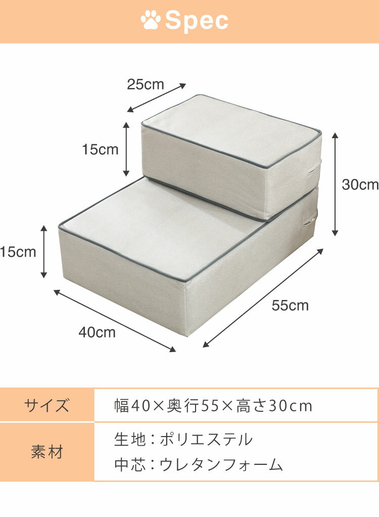 ■特長・高さ調節可能な2段のドッグステップです。・滑り止め付きで安全にご使用いただけます。・匂いの少ない単層構造ウレタンです。・カバーは取り外して手洗いできます。・パイピング処理で安全&高強度です。■サイズ(約)幅40×奥行55×高さ30cm■素材生地:ポリエステル中芯:ウレタンフォーム※サイズには若干の差がございます。※商品の仕様は予告なく変更になる場合がございます。※商品の色味はモニターの機種や設定により実際の商品と異なる場合があります。予めご了承ください。※生産ロットにより、同じカラーでも多少の色差があることがございます。ご了承ください。【特長】マット、ペットマット、室内犬、介護、はっ水、ドッグ、ソファステップ、ベッドステップ、オシャレ、インテリア、オットマン、チェア、猫、猫用品、キャットステップ、段差、子犬、小犬、小型犬、踏み台、ヘルニア、健康、転倒防止、安全、ヘルニア対策、ダックスフント、ペット用階段【送料について】北海道、沖縄、離島は別途送料を頂きます。ドッグステップ 階段タイプPUレザー2段/幅40cmPUレザー2段/幅55cmスエード2段/幅40cmスエード2段/幅55cmファブリック2段/幅40cm収納付き3段/幅35cmドッグステップ なだらかタイプ波型2段/高さ30cm波型3段/高さ30cm波型3段/高さ40cm波型4段/高さ34cm波型4段/高さ52cmスロープ型/高さ37cm2つ折りスロープ