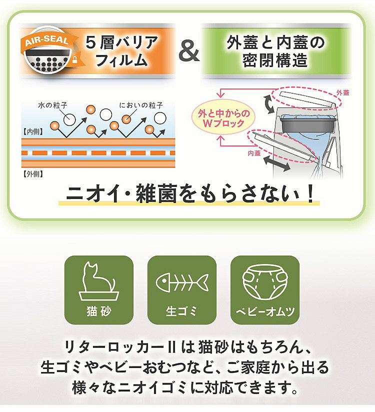 【商品説明】猫用防臭ボックスの専用カートリッジ。5層バリアフィルムでニオイを強力にブロック。カートリッジの取替も簡単です。本体の底面につく長さを1回分の目安とし、カートリッジ1つで約6回分ご使用できます。●材質本体:ポリプロピレン袋:ポリエチレン、EVOH●サイズ直径17cm×高さ5cm●生産国カナダ【送料について】北海道、沖縄、離島は送料を頂きます。リターロッカーII本体+カートリッジ取替カートリッジ 単品取替カートリッジ 2個セット取替カートリッジ 3個セット取替カートリッジ 5個セット取替カートリッジ 6個セット取替カートリッジ 9個セット取替カートリッジ 10個セット取替カートリッジ 12個セット取替カートリッジ 24個セット