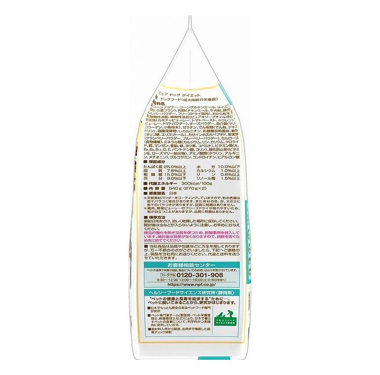 【取り寄せ品のご注意事項(ご注文前にご確認ください)】・本商品は原則注文後のキャンセルはお受けできません。・本商品と他商品で同梱注文をいただき、仮に他商品が完売等でご用意できない場合でも本商品は発送させていただきます。・本商品を複数(2点以上)注文いただき、完売等で注文数のご用意できない場合でもご用意できた数量は発送させていただきます。【商品説明】脂肪分とカロリー調整でおいしくダイエット!おいしく食べて体重コントロール。低脂肪&カロリー調整、国産鶏肉と野菜ピューレーのフリーズドライ入り〇原材料(成分)穀類(コーンフラワー、コーングルテンミール、ライスブラン、小麦粉、小麦ブラン)、肉類(チキンミール、牛肉粉、豚肉粉、チキンレバーパウダー、フリーズドライ鶏肉)、おから粉末、油脂類(動物性油脂、植物性油脂(ピュアオリーブオイル含む))、野菜類(カボチャピューレー、トマトペースト、ホウレンソウピューレー、トマトパウダー)、チーズパウダー、魚介類(マリンコラーゲン、小魚粉末)、ゼラチン、でん粉類(でん粉、デキストリン)、麹菌発酵物、L-カルニチン、乳酸菌加熱菌体、糖類(オリゴ糖、エリスリトール)、カゼインホスホペプチド、果実類(クランベリーパウダー、ブルーベリーパウダー)、セルロース(食物繊維)、ミネラル類(カルシウム、リン、カリウム、クロライド、銅、マンガン、亜鉛、鉄、ヨウ素、コバルト)、ビタミン類(A、B2、B6、B12、D、E、パントテン酸、コリン)、酸化防止剤(ビタミンE、ローズマリー抽出物)、アミノ酸類(タウリン、アルギニン、メチオニン)、グルコサミン、コンドロイチン、ヒアルロン酸〇保証成分たんぱく質25.0%以上、脂質7.8%以上、粗繊維15.0%以下、灰分9.0%以下、水分10.0%以下、カルシウム1.0%以上、リン0.8%以上、リノール酸1.5%以上〇賞味/使用期限(未開封)540日※仕入れ元の規定により3ヵ月以上の商品のみ出荷致します〇保管方法別途パッケージに記載〇原産国日本〇メーカー名日本ペットフード 株式会社【送料について】北海道、沖縄、離島は送料を頂きます。