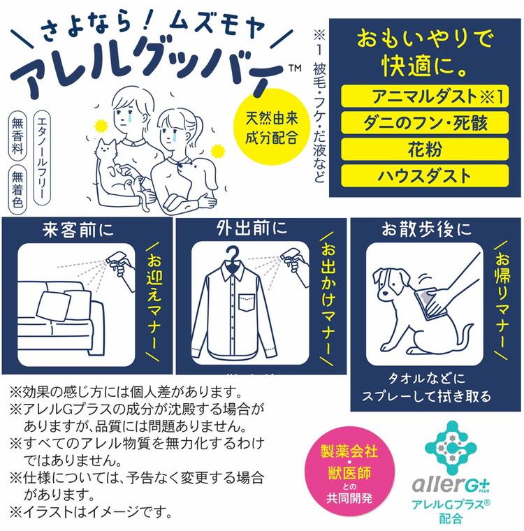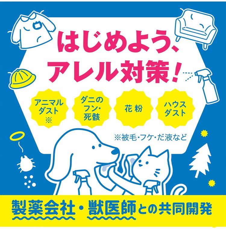 【商品説明】・業界初のペットにもやさしい成分でつくった、花粉・ダニのフン・死骸・ハウスダスト・アニマルダスト(被毛・フケ・だ液など)に効果があるアレル対策スプレーです。・有効成分のアレルGプラスは、天然鉱物から生成される無機物で、アレル物質を無力化する効果があります。・無香料、無着色、エタノールフリー、また天然由来成分なので、わんちゃんねこちゃんにもやさしい安心仕様です。○材質精製水、アレルGプラス、防腐剤○商品使用時サイズ85×185×66(mm)○原産国日本○メーカー名ドギーマンハヤシ 株式会社【取り寄せ品のご注意事項(ご注文前にご確認ください)】・本商品は原則注文後のキャンセルはお受けできません。・本商品と他商品で同梱注文をいただき、仮に他商品が完売等でご用意できない場合でも本商品は発送させていただきます。・本商品を複数(2点以上)注文いただき、完売等で注文数のご用意できない場合でもご用意できた数量は発送させていただきます。【送料について】北海道、沖縄、離島は送料を頂きます。