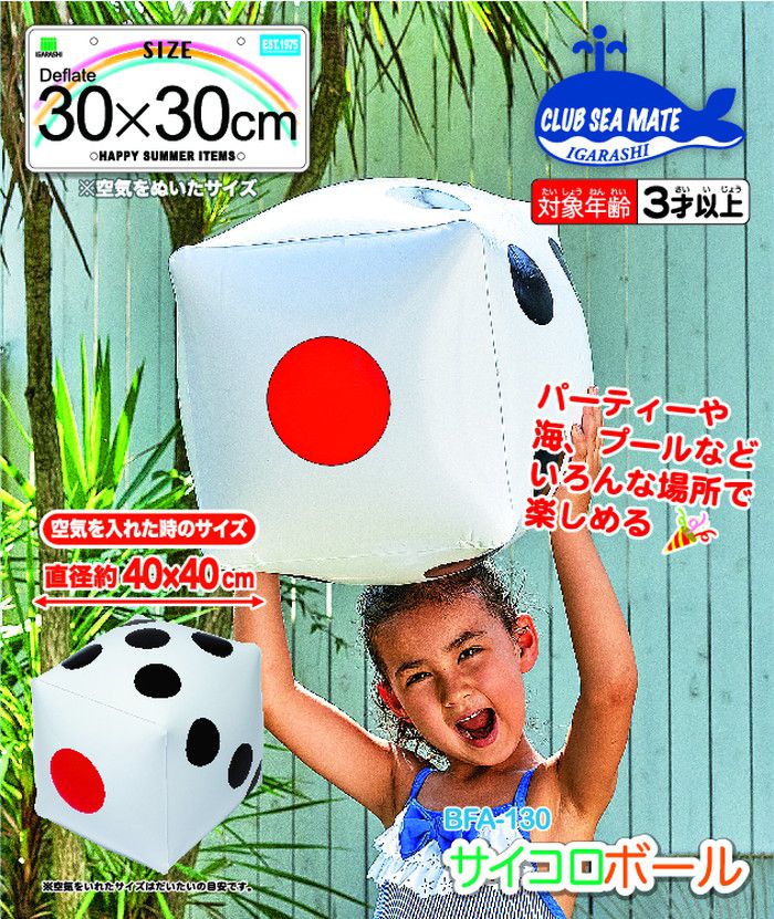 メーカー名:(株)イガラシ 販売業者:(株)イガラシ 原産国:中国 素材:塩化ビニル樹脂(玩具安全基準適合PVC) 空気栓:1 対象年齢:3歳以上 パッケージ形態:PEバック入り(18×24cm) 商品サイズ:30×30×30cm 膨らんだ状態のサイズ:約40×40×40cm【特長】プール、レジャーグッズ、マリンスポーツ、夏休み、海水浴、ビーチ、リゾート、旅行、海外、ウォーター【送料について】北海道、沖縄、離島は送料を頂きます。