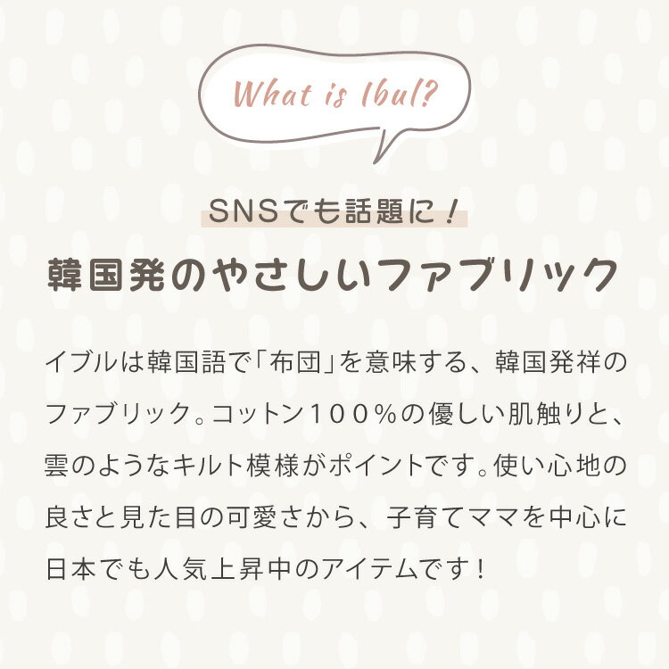■特長・綿100%でオールシーズン快適にお過ごしいただけます・ウォッシャブルでうっかり汚れてしまってもお気軽に丸洗いが可能です・ひざ掛けや敷きパッドなど、様々なシーンに合わせてご使用いただけます・インテリアに合わせやすいクラウド型のキルティングです■サイズ(約)195cm×195cm■素材生地:綿100%中綿:綿85% レーヨン10% ポリエステル5%■生産国中国※サイズには若干の差がございます。※商品の色味はモニターの機種や設定により実際の商品と異なる場合があります。予めご了承ください。※生産ロットにより、同じカラーでも多少の色差があることがございます。ご了承ください。ページ修正日:2024/11/12ページ修正点:カラーバリエーション変更しました。中綿の材質は「ポリエステル100%」から「綿85% レーヨン10% ポリエステル5%」に変更しました。【特長】キルトケット、イブル、イブルマット、195×195cm、敷きパッド、韓国、赤ちゃん、キルティング、ラグ、オールシーズン、ベビーマット、ラグマット、綿、コットン、お祝い、おしゃれ、かわいい、出産祝い、プレゼント、ギフト、新生児、子供、プレイマット、ウォッシャブル、マルチカバー、ひざ掛け、ブランケット、ベッドシーツ、ソファカバー、防菌、抗菌【送料について】北海道、沖縄、離島は送料を頂きます。イブル キルトケット150×195cm195×195cm195×250cm