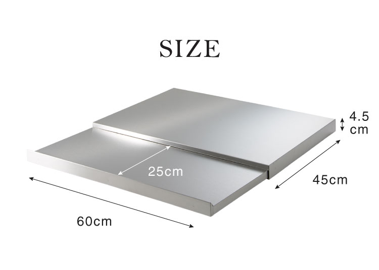 【商品説明】キッチンが手狭に感じるけど、作業台を置くスペースもないとお悩みの方に!必要な時だけ引き出して使えるキッチンスライドテーブルです。設置方法は家電の下に置くだけ。組み立て不要の完成品なので届いてすぐその便利さを実感できます。材質は、サビに強く、汚れてもお手入れ簡単なステンレス製。余計な飾りのないシンプルデザインなので、違和感なくキッチンに馴染みます。調理途中のボウルやおたまなどの一時置き場、ごはんの盛り付け台など、様々な使い方で調理を手助け。使わない時は収納してスッキリとしたキッチンに。【サイズ】本体:約幅60×奥行45×高さ4.5cm天板スペース:約60×42cmスライドテーブル部内寸:約59×25cm重量:約3.6kg【耐荷重】天板:約 30kgスライド部分:約 3kg【材質】ステンレス【生産国】日本【備考】完成品滑り止めクッションシール4個付き用途:レンジ、トースター、炊飯器などのキッチン家電の下に置くだけ。スライドトー、スライドテーブルとして、キッチンラックのスペース拡大に。【代引きについて】こちらの商品は、代引きでの出荷は受け付けておりません。【送料について】北海道、沖縄、離島は送料を頂きます。燕三条 ステンレス スライドテーブル幅30×奥行40cm幅45×奥行40cm幅55×奥行50cm幅60×奥行45cm幅45×奥行40cm 引出し収納付き幅55×奥行50cm 引出し収納付き