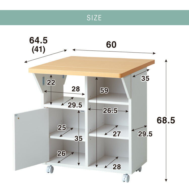 【サイズ】幅60×奥行64.5(41)×高さ68.5cm【内寸】扉無し空間内寸:幅26.5×奥行28×高さ59cm扉内内寸:幅28×奥行26×高さ35cm扉上空間内寸:幅28×奥行29.5×高さ22cm天板最大サイズ:幅60×奥行64.5cm【素材】プリント紙化粧繊維板【生産国】日本【商品重量(kg)】約13.5【耐荷重(kg)】全体:約25kgバタ部:約5kg棚板:約5kg【備考】お客様組み立て品【組み立てにご用意いただくもの】プラスドライバーをご用意ください。【代引きについて】こちらの商品は、代引きでの出荷は受け付けておりません。【送料について】北海道、沖縄、離島は送料を頂きます。キッチンワゴン サイズバリエーション幅60cm幅90cm