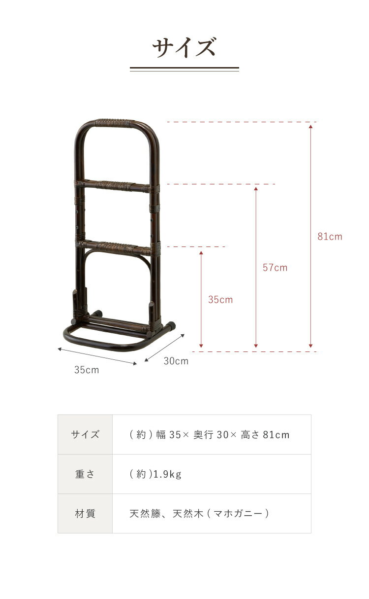 ●サイズ:(約)幅35×奥行30×高さ81cm●重さ:(約)1.9kg●素材/天然籐、天然木(マホガニー)●インドネシア製●つらい立ち上がりをサポート。●膝や腰の負担を軽くし、ラクに立ち上がれます。●居間に、トイレに、寝床に。●お客様組み立て品【代引きについて】こちらの商品は、代引きでの出荷は受け付けておりません。【送料について】北海道、沖縄、離島は送料を頂きます。