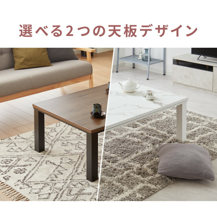 【特長】・オールシーズン使えるこたつテーブルです。・春から秋はセンターテーブルとして、冬はこたつとして使用できます。・ヒーターには、国内メーカーの「メトロ電気工業」製の石英管ヒーターを採用。・いろんなお部屋に合うように、ヴィンテージタイプ、大理石タイプなどいろんな柄を用意しました。・布団セットは2タイプからお選びいただけます。・選べる10色タイプは中綿が1.9kgとしっかり綿が入っており、ふっくら仕上げ・フランネル×シープボアタイプはリバーシブルで使え、かつ中綿が2.5kg入っているのでまるでお布団被っているような感覚■こたつ【サイズ】商品サイズ:幅105×奥行き75×高さ39cm高さ内寸:35cm幅内寸:90.7cm上天板サイズ:幅105×奥行き75cm【耐荷重】約20kg【材質】MDF(ウレタン塗装)【その他】お客様組み立て品(脚の取り付け)【ヒーターに関して】製造メーカー:メトロ電気工業株式会社(日本のメーカー)サイズ:28.8×28.8×6.3cm電源:100V 50-60Hz温度調整:サーモスタット消費電力:300W安全装置:温度ヒューズ133℃発熱体:U字型石英管ヒーターコード長さ:3m■こたつ布団・選べる10色タイプ【サイズ】185×235cm(適応こたつ天板サイズ:75cm×105cm)【材質】本体部分:ポリエステル100%襟:裏部分:ポリエステル100%抗菌防臭加工詰め物:ポリエステル100%中綿重量1.9kg・フランネル×シープボアタイプ【サイズ】190×240cm(適応こたつ天板サイズ:75cm×105cm)【材質】表:ポリエステル100%(フランネル)裏:ポリエステル100%(シープボア)詰め物:ポリエステル100%中綿重量2.5kg【代引きについて】こちらの商品は、代引きでの出荷は受け付けておりません。【送料について】北海道、沖縄、離島は送料を頂きます。あったかこたつシリーズこたつ掛け布団 正方形/長方形こたつ掛け布団 円形/楕円形石英管こたつセットカジュアルこたつ シリーズこたつテーブル単品 80×60cmこたつ布団セット 80×60cmこたつテーブル単品/こたつ布団セット 継ぎ脚式 105×75cmこたつテーブル単品/選べるこたつ布団セット 105×75cmこたつテーブル単品/選べるこたつ布団セット mocone 105×75cm