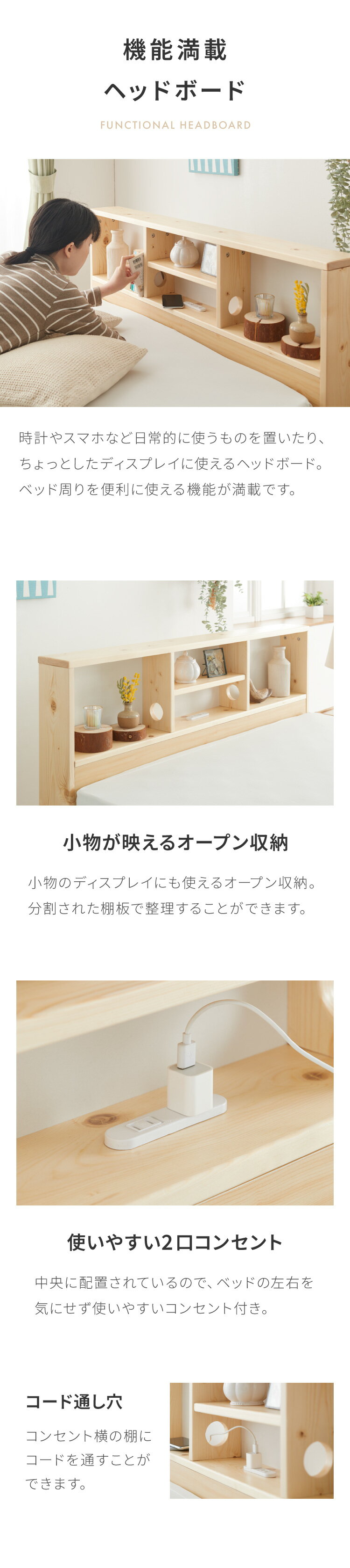 天然木パイン材を使用したベッドフレーム「ミッシェル」とボンネルコイルマットレスのセットになります。3段階調整可能で、ローベッドとしても使用可能です!ヘッドボードにも機能満載!2口コンセント付きで仕切り板にはコード通し用の穴を開けました!ナチュラル、ブラウンはバイカラーでおしゃれな仕様に!シンプルながらおしゃれで機能的なベッドフレームに仕上げました!■商品名ミッシェル -Michael-ベッドフレーム シングル / セミダブル / ダブル選べるフレーム単品/マットレスセット(ポケットコイル・ボンネルコイル)■商品サイズ[フレームサイズ]シングル:幅98.5×奥行211×高さ86.3/73.3/60.3cmセミダブル: 幅120.5×奥行211×高さ86.3/73.3/60.3cmダブル:幅140.5×奥行211×高さ86.3/73.3/60.3cm[ポケットコイルマットレスサイズ]シングル:幅97×奥行195×厚さ20cm(許容範囲±5%)セミダブル:幅120×奥行195×厚さ20cm(許容範囲±5%) ダブル:幅140×奥行195×厚さ20cm(許容範囲±5%)[ボンネルコイルマットレスサイズ]シングル:幅97×奥行195×厚さ14cmセミダブル:幅120×奥行195×厚さ14cmダブル:幅140×奥行195×厚さ14cm■素材・ベッドフレーム[フレーム]天然木パイン[床板]LVL積層合板・マットレス[ポケットコイルマットレス]コイルスプリング詰め物:不織布外装生地:ポリエステルクッション材:ウレタンフォーム[ボンネルコイルマットレス]コイルスプリング詰め物:ウレタン、不織布、フェルト(ポリエステル)外装生地:ポリエステル■線形・コイル数[ポケットコイルマットレス]シングル:1.8mm 5巻き、528個セミダブル:1.8mm 5巻き、660個ダブル:1.8mm 5巻き、759個[ボンネルコイルマットレス]シングル:2.1mm 5巻き、320個セミダブル:2.1mm 5巻き、384個ダブル:2.1mm 5巻き、448個■その他圧縮ロール梱包※こちらの商品は一般的なマットレスより小さめに作ってあります。■内容ベッドフレーム×1マットレス×1■生産国中国■備考フレームはお客様組み立て商品【特長】ホテル、レストラン、高級、おすすめ、ホテル、民泊、在宅ワーク、テレワーク、宿泊施設、寮、法人【送料について】北海道、沖縄、離島は別途送料を頂きます。リコメン堂おすすめベッドシリーズすのこベッドすのこベッド 高さ3段階調整すのこベッド 高さ3段階調整 宮棚付き/バイカラー シングル〜ダブルすのこベッド ウェンディ 宮棚付き 高さ3段階調整 シングル〜ダブルすのこベッド プリーモ 宮棚付き 高さ3段階調整 シングル〜ダブルすのこベッド 引き出し2杯 宮棚付きパイプベッドパイプベッド 宮棚付きミドルパイプベッドスチールベッド宮付きスチールベッドミドルスチールベッドフロアベッド/セミシングル〜ダブルフロアベッド/クイーン160(SS+SS)〜ワイドキング280(D+D)収納ベッド/セミシングル〜ダブル収納ベッド/クイーン160(SS+SS)〜ワイドキング280(D+D)チェストベッド 引き出し4杯チェストベッド 引き出し5杯