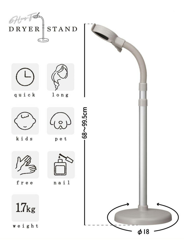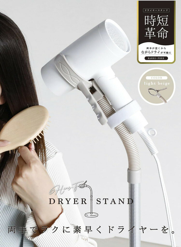 両手が空くから”ながらドライ”ができる。ブラシやタオルが使えてドライヤー時間が快適になる。「ハンズフリードライヤースタンド」お風呂後に子供の髪を乾かすとき、両手が使えるのでタオルドライがしやすく、素早く乾かすことができます。ペットのトリミング、シャンプー後のドライにも便利です!動き回りがちなペットも両手が使えるので、素早く乾かすことが出来ます。アーム部分は360度回転可能。高さは無段階調節式なので、その時々の使い方に合わせて調節できます。商品サイズ:約径18×高68〜99.5cm※アーム部分を含む商品重量:約1.7kg主材質:[クリップ・アーム]EVA・ABS・PE・スチール、[パイプ]アルミニウム・ABS、[ベース]ABS・シリコーンゴム、[面ファスナー]ナイロン使用可能重量:700g以下のドライヤー※本商品に取り付けられるドライヤーの大きさは直径約4.5〜7cmです。それ以外の大きさのドライヤーは使用しないでください。※本商品はドライヤーの取り付け方、機種や形状、重量によっては使用できない場合があります。予めご了承ください。【代引きについて】こちらの商品は、代引きでの出荷は受け付けておりません。【送料について】北海道、沖縄、離島は別途送料を頂きます。