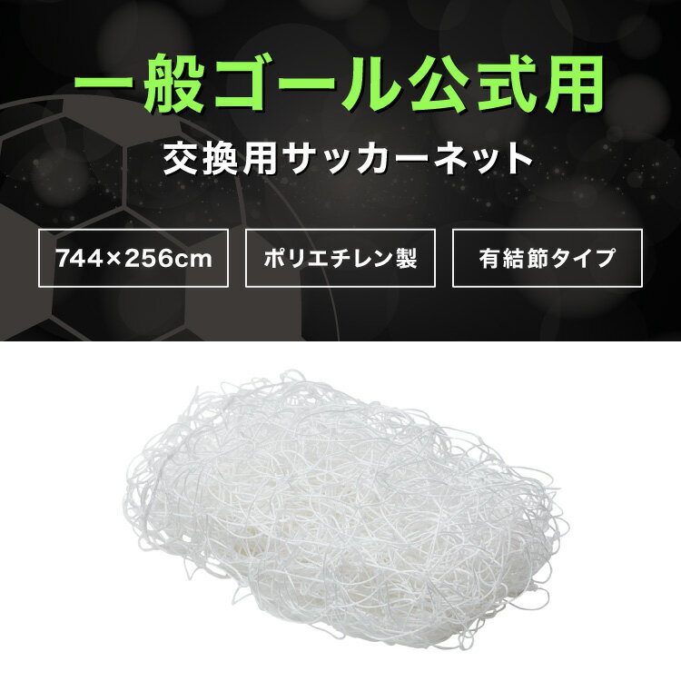 【特徴】・練習で傷んでしまったゴールネットの交換に・公式サイズで部活動やクラブチームのサッカーゴールにも対応・激しい練習にも耐える丈夫な素材【サイズ(約)】幅744×高さ256×奥行き(上)150×奥行き(下)240cm網目:14×14cmネットの太さ3mm(440t/60本)※許容範囲:約±5%【素材】ポリエチレン【重量(約)】3.74kg※ネットのみの販売になります※サイズには若干の差がございます。※商品の仕様は予告なく変更になる場合がございます。【特長】サッカーゴール、ネット、交換用、ネットのみ、張替、トレーニング、スポーツ、体育、学校、部活動、クラブチーム、ジュニアサッカー、少年サッカー、フットサル、四角目、網目、ネット、網、少年用、ジュニア用、8人制、11人制、サッカー、子供、大人【送料について】北海道、沖縄、離島は送料を頂きます。張り替え用サッカーゴールネットフットサル公式サイズ/310×210cm少年サッカー推奨サイズ/510×220cm一般用公式サイズ/744×256cm