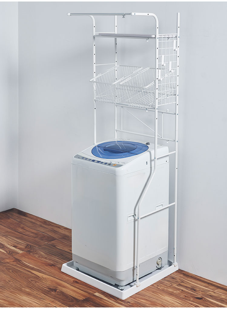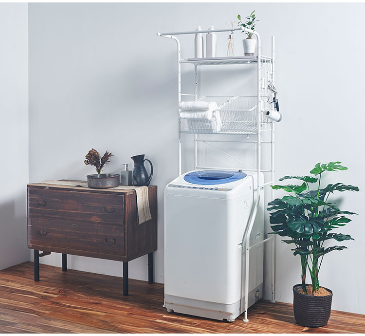 ■商品サイズ幅59〜87×奥行51.5×高さ182〜191cm9500g■お客様組立式■材質本体:スチール棚板:合成樹脂化粧板■耐荷重棚板1段当たり5kgハンガー部分2kgカゴ2kg■商品説明洗濯機上のスペースを使って、日頃使う日用品をスッキリ収納。シンプルなデザインで、洗濯機の色や形、ランドリースペースの雰囲気も選びません。洗濯物の持ち運びにも便利な持ち手付きのカゴがセットのランドリーラックです。【代引きについて】こちらの商品は、代引きでの出荷は受け付けておりません。【送料について】北海道、沖縄、離島は送料を頂きます。ランドリーラック幅55cm ロータイプ高さ135~208cm/棚板2枚幅55cm ロータイプ高さ135~208cm/棚板3枚幅55cm ハイタイプ高さ198~264cm/棚板3枚幅58cm ロータイプ高さ145~208cm/棚2枚+バスケット1個幅58cm ハイタイプ高さ210~263cm/棚2枚+バスケット1個+ハンガーバー1本幅59~87cm/棚板1枚+カゴ2個+ハンガーバー1本幅59~87cm/棚板2枚+ハンガーバー1本
