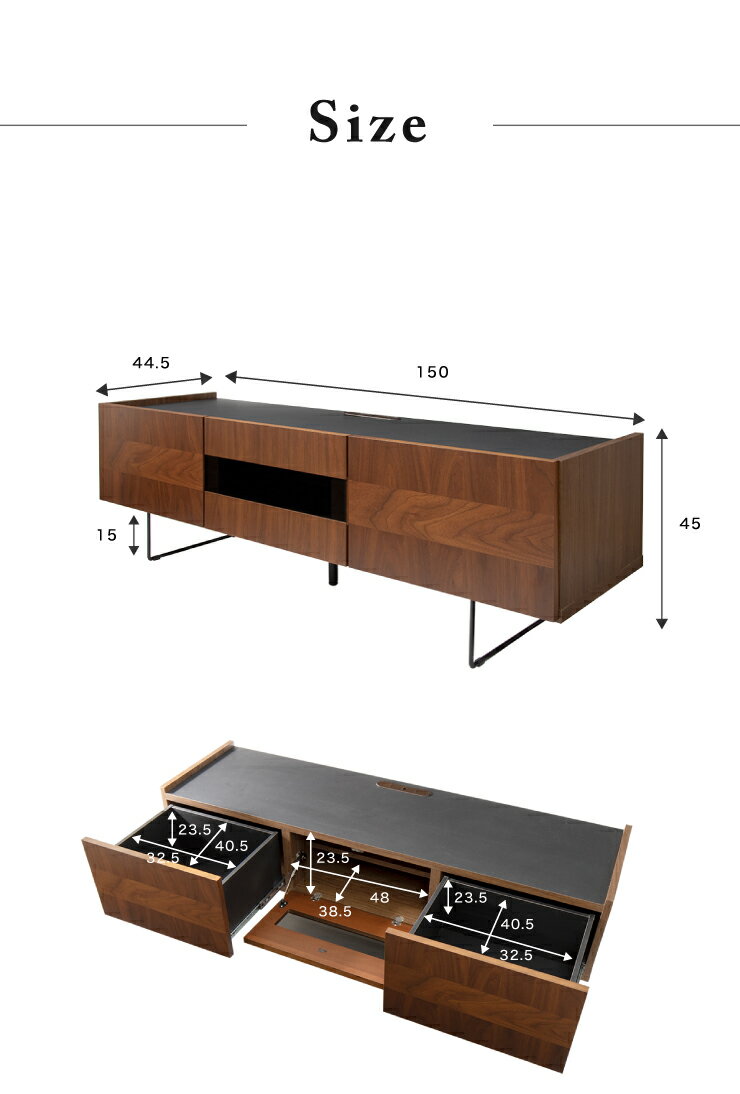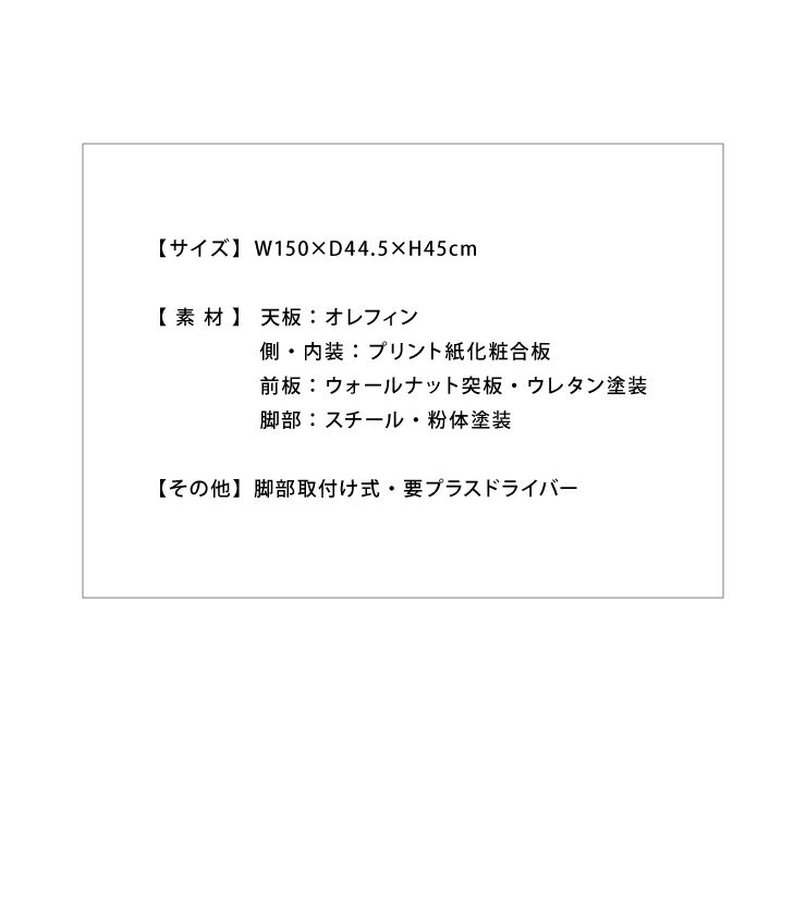 【商品説明文】スマートなデザインのスチール脚。雰囲気を高めるマットなブラック天板。たっぷり入る収納スペース。お部屋をワンランク上に導く、日本製のローボード。【サイズ】幅150×奥行44.5×高さ45cm【重量】36kg【素材】天板:オレフィン側・内装:プリント紙化粧合板前板:ウォールナット突板・ウレタン塗装脚部:スチール・粉体塗装【生産国】日本【その他】脚部取付け式・要プラスドライバー【代引きについて】こちらの商品は、代引きでの出荷は受け付けておりません。【送料について】北海道、沖縄、離島は送料を頂きます。【商品配送時の注意点】こちらの商品は配送日時の指定ができません。あらかじめご了承下さい。【商品配送時の注意点】本商品は軒先渡しの商品となります。