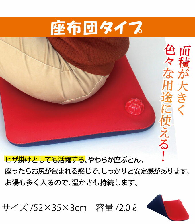 【商品詳細】・商品名クロッツやわらか湯たんぽ座布団タイプ・品番HY-613・商品サイズ(約)52×35×3cm・商品重量(約)600g・個装サイズ(約)41.5×51.5×8.5cm・材質本体/クロロプレンゴム、ナイロン、PETキャップ/ABS・容量(約)2.0L・耐熱温度100℃・セット内容ネジ付きロート、商品チラシ、取扱説明書兼保証書・保証1年間・注意事項●お湯を入れる際は安全のため、ネジ付きロートを使用してください。●キャップはしっかりと固く締めてください。締めが緩いとお湯漏れの原因になります。●キャップ内側のゴムパッキンが漏れを防ぎます。必ずパッキンがついていることを確認の上、キャップをお締めください、また、パッキンの端が浮き上がらないよう平らな場所で使用してください。●検品の為、湯たんぽの中が濡れている場合がありますが、ご使用には差し支えありません。・原産国日本※注意事項※同梱不可商品となります。※同商品を同時購入の場合のみ同梱可能となります。【代引きについて】こちらの商品は、代引きでの出荷は受け付けておりません。【送料について】北海道、沖縄、離島は送料を頂きます。クロッツ 新やわらか湯たんぽたまご型ポケット型首用座布団タイプ足用ショート レッド足用ショート ブラック