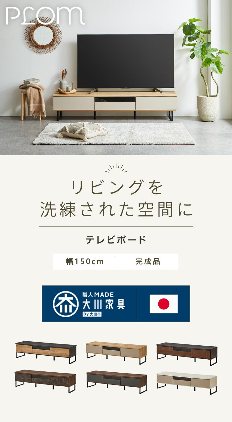 〜PLOMシリーズ〜スタイリッシュなバイカラーテレビ台。脚部はブラックアイアン仕様でお掃除ロボットにも対応しています。引き出しはフルオープンレール仕様。背面にも隠せる収納スペースがあるので電源アダプターなどを収納できます。■商品名PLOM プロム ローボード150■商品サイズ[本体サイズ]幅149.5×奥行44.5×高さ41cm[脚部高さ]15cm■素材[本体]MDF/強化シート(真空貼り)[脚部]スチール[ガラス]ブラック4mm強化ガラス■重量約31kg■生産国日本製(大川家具)■備考完成品(脚部のみ取り付け)■梱包サイズ151×46.5×28cm1個口【代引きについて】こちらの商品は、代引きでの出荷は受け付けておりません。【商品配送時の注意点】こちらの商品は配送日時の指定ができません。あらかじめご了承下さい。【商品配送時の注意点】本商品は軒先渡しの商品となります。【送料について】北海道、東北、沖縄、離島は送料を頂きます。大川家具テレビ台 幅150テレビ台 幅180テレビ台 幅210テレビ台 ミドルボード 幅80テレビ台 ミドルボード 幅110センターテーブル 幅105