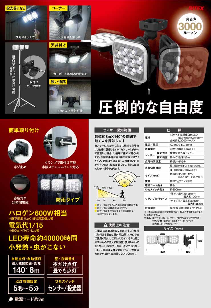 商品サイズ:幅32.2×奥行12.5×高さ14.6cm 920g原産国:中国完成品電源=AC100V電源(コード長:3m)・消費電力=約37W(待機時:1.0W以下)点灯時間=約5秒〜約5分・昼夜切替え機能=あり(昼の明るいときも点灯/夜の暗いときだけ点灯)センサー機能:探知角度=水平約140°・探知距離(最大)=約8m設置場所=屋内、屋外用(防雨タイプIP44)12W×3灯で強力照射。防雨タイプで屋外・屋内どちらでも取り付け可能圧倒的な自由度。新構造で照射方向・取りつけが自由自在のフリーアーム式のセンサーライト。今までできなかった天井取付けが可能。カーポート等斜めの柱にも・ひもスイッチで投光器に。付属の取付けパーツで市販の投光器スタンドに取付け可能※投光器スタンドは付属しておりません。探知センサーで自動点灯・自動消灯。侵入者には防犯、家人には便利な灯り。玄関、庭、ガレージ、倉庫などに。明るさ重視のコンセント(AC電源)タイプ。電源コード長さ3m。12W×3灯の高輝度LED。明るさは約3000ルーメン(ハロゲン600W相当)※直下照度(Lux)メーカー測定値比較。電気代約1/15※600Wハロゲンとの比較ワイド照射。3灯で3方向を同時照射。昼(まわりが明るくても点灯)・夜(まわりが暗いときだけ点灯)で点灯切替可能。5秒〜5分の点灯時間設定可能。ひもスイッチで常時点灯。防雨タイプ。雨に濡れる場所にも設置可能※大量の水がかかる場所へは設置しないでください。赤色LEDが常時点滅。24時間しっかり警戒。取りつけ簡単。クランプ、ネジ止めで取付可能。市販ステンレスバンドにも対応。様々な場所で活躍します。コーナー=広範囲を照らします。玄関-車庫・正面と後、両方を照らします。狭い通路=180°以上照射可能。LED寿命約4万時間。LEDなので小発熱・虫が集まりにくい。最遠約8m×140°の範囲で動く人や車を探知。・電源=AC100V(50/60Hz)・消費電力=37W(待機時1.0W)・コード長=3m・ひもスイッチ長さ=50cm・電球=12W×3 高輝度白色LED(設計寿命約4万時間)・全光束:約3000ルーメン・センサー=(探知方式)焦電型赤外線センサー・(探知範囲)約140°最遠約8m・点灯時間設定:約5秒〜約5分、点灯切替機能=昼(周囲が明るくても暗くても点灯)/夜(周囲が暗い時のみ点灯)・クランプ取付サイズ:(厚み)最小約15mm〜最大約100mm・(パイプ径)最小約30mm〜最大約85mm・設置場所=屋内・屋外用(防雨タイプIP44)・保証期間:1年・付属品=取付けネジ×2・コンクリート用プラスチックプラグ×2・クランプ台・蝶ナット・L型ボルト・ネジキャップ・投光器スタンド取付けパーツ・取扱説明書・保証書【代引きについて】こちらの商品は、代引きでの出荷は受け付けておりません。【送料について】北海道、沖縄、離島は送料を頂きます。12W フリーアーム式 LED センサーライト12W×1灯12W×2灯12W×3灯