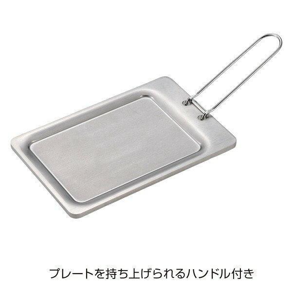 【商品説明】厚さ6mmの極厚ステンレスグリルプレート。丈夫で錆びにくく蓄熱した熱で均等に美味しく焼けます。プレートを持ち上げられるハンドル付き。別売の「UH-4115 アルミ角型クッカーL」の中に収納できます。製品サイズ(約) 本体:180×120×高さ10mm、ハンドル:全長125mm重量(約) 980g材質(品質) 本体:ステンレス鋼、ハンドル:鉄(クロムめっき)個装サイズ:18×12.5×3.3【送料について】北海道、沖縄、離島は送料を頂きます。