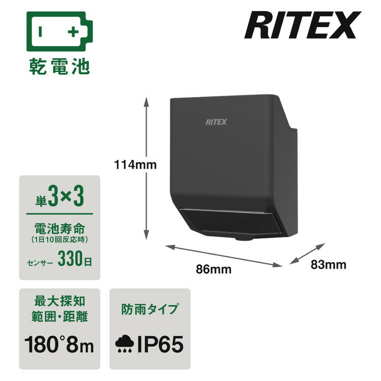 つながる!無線連動シリーズ。最大16台を同時に自動点灯する、新しい照明。帰宅時の灯り、家の裏手、庭の防犯などに使用可能。無線の設定は、4つのスイッチを合わせるだけの簡単設定。商品サイズ:幅8.6×奥行8.3×高さ11.4cm材質:PC、HDPE乾電池タイプ(単3×3個)探知範囲:約180°、距離:約8m送信専用防雨タイプIP65【代引きについて】こちらの商品は、代引きでの出荷は受け付けておりません。【送料について】北海道、沖縄、離島は送料を頂きます。RITEX つながる無線連動シリーズセンサーライト/7W×1灯/W-600センサーライト/7W×2灯/W-610乾電池式センサーライト/3W×1灯/W-620ソーラー式センサーライト/3W×1灯/W-630ソーラー式ガーデンセンサーライト/W-640乾電池式チャイム&ライト/W-650乾電池式センサー/W-660乾電池式チャイム&ライト+センサーセット/W-670