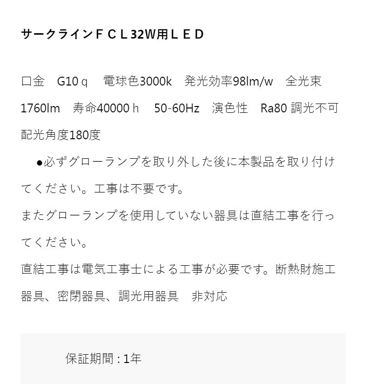 ■商品サイズ直径3×29.9cm■重量260g■特徴丸形蛍光灯の代替として開発されたLEDライト。FCL32W型 (電球色) 電源内臓タイプ。■備考口金:G10q定格入力電圧:100V定格消費電力:18W色温度:3000K(電球色)配光角度:180度全光束:1760lm平均演色評価数:Ra80グローブ種別:樹脂、乳白管径:30mm外径:299mm質量:260g定格寿命:40000時間断熱施工器具:×密閉器具対応:×調光器対応:×【代引きについて】こちらの商品は、代引きでの出荷は受け付けておりません。【送料について】北海道、沖縄、離島は送料を頂きます。LEDサ−クライン蛍光灯FCL20W型 昼白色FCL30W型 電球色FCL30W型 昼白色FCL32W型 電球色FCL32W型 昼白色FCL40W型 電球色FCL40W型 昼白色