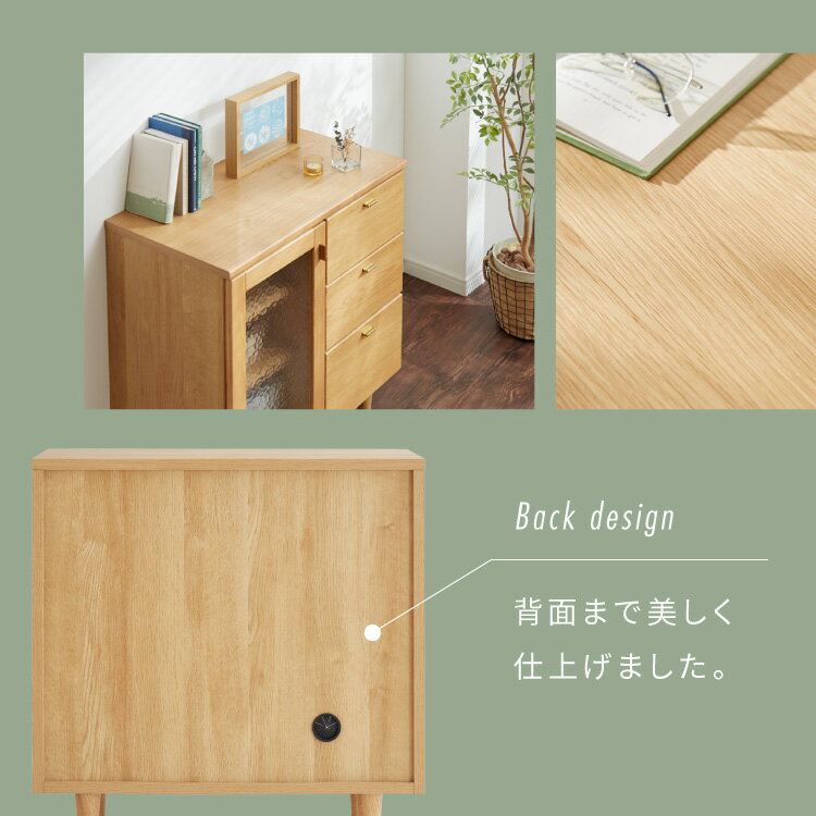 天然木を使用した温かみある質感のキャビネット(幅74cm)ガラス扉収納には、小物や食器をおしゃれに飾ることができます。3杯の引き出しは開閉がスムーズで、奥まで引きだせるため物が取りやすいです。脚付きなので、かわいらしくスッキリとした印象に!脚の高さは12cmあり、お掃除の手も届きやすい!ロボット掃除機も入り込めるスペースです。■商品サイズ本体幅74×奥行40×高さ75cmガラス扉収納内寸(約)幅33cm、奥行36cm、高さ58cm可動棚2枚(33×28.5cm)棚ダボ:6段(6cmピッチ)引き出し(上段/中段)内寸(約)幅28cm、奥行32.5cm、高さ(側板)10cm有効高さ13cm引き出し(下段)内寸(約)幅28cm、奥行32.5cm、高さ(側板)14cm有効高さ17cm■素材ウォールナット/オーク突板■重量28kg■生産国ベトナム■備考お客様組立品■梱包サイズ79×45×67cm【特長】リビング、天然木、木製、マンション、ビル、事務所、レストラン、高級、おすすめ、ホテル、民泊、在宅ワーク、テレワーク、オフィス、コワーキングスペース、戸建て、一軒家、新築、リゾート、賃貸、住宅、団地、都心、モダン、クラシック、ナチュラル、和室、寝室、子供部屋、社宅、寮、社員寮、レース、カーテン、一人暮らし、かわいい、かっこいい、プライベート、安心、安全、高品質、自宅、別荘、ペントハウス、社長室、プレゼント、新生活、上京、スマート、シンプル【代引きについて】こちらの商品は、代引きでの出荷は受け付けておりません。【商品配送時の注意点】こちらの商品は配送日時の指定ができません。あらかじめご了承下さい。【商品配送時の注意点】本商品は軒先渡しの商品となります。【送料について】北海道、東北、沖縄、離島は送料を頂きます。天然木 家具 シリーズキャビネット 幅40cmキャビネット 幅74cmキャビネット 幅110cmスライドシェルフセンターテーブル